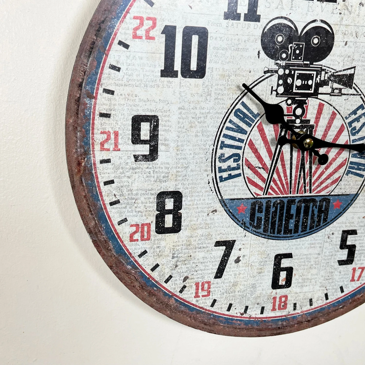 Clock design is a movie camera from the film festival with a standard 12 hour display. Distressed finish on both. Wall Mounted clocks that are battery powered. Batteries not included.