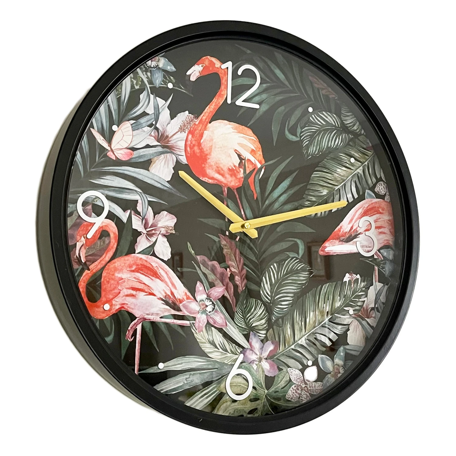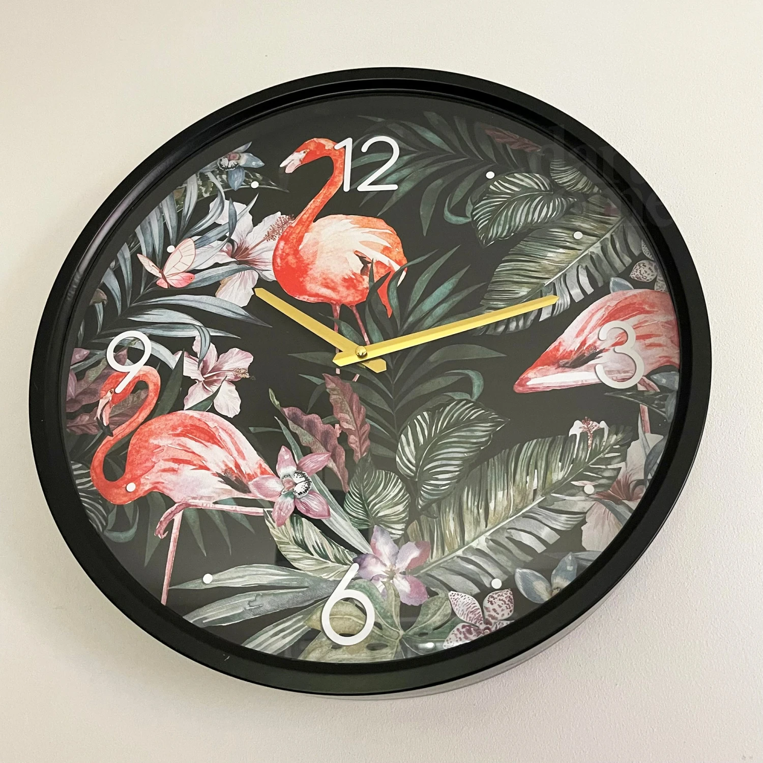 This modern wall mounted clock boasts a tropical flamingo face design. This is a wall mounted battery powered clock with a round face and is suitable for indoor use only.