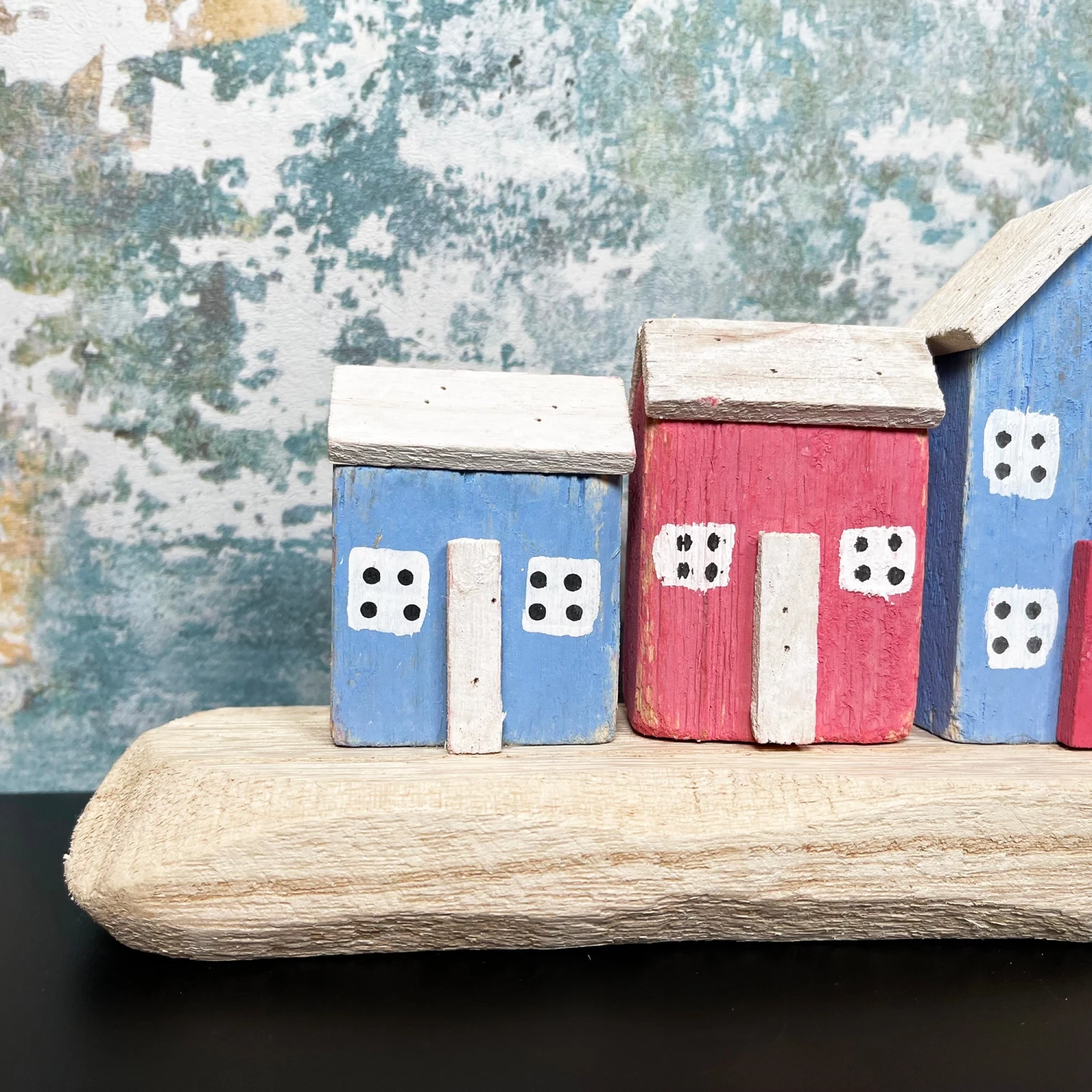 Brilliant shelf sitters in a 3d red, white and blue wooden harbour houses design sitting on a rectangular wooden base. This distressed ornament is perfect for neutral bathroom decor to add to the nautical theme and colourway surrounding the area.