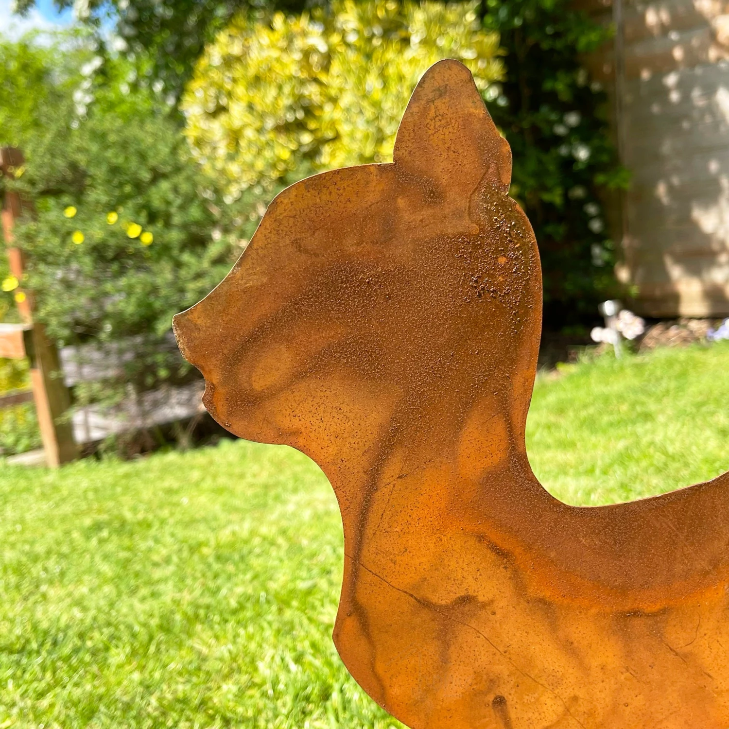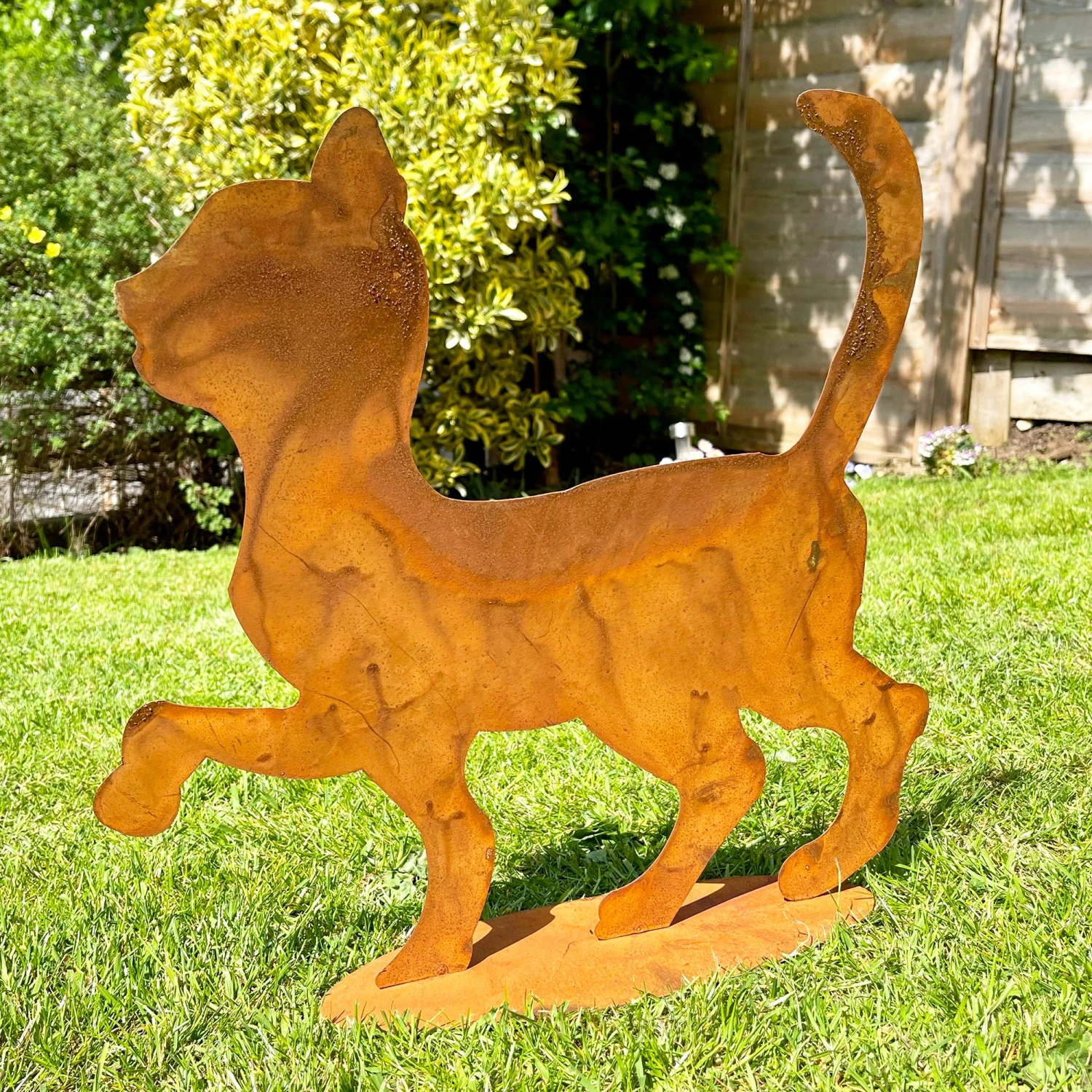 Large walking cat made from metal in a rusty finish. This antique style sculpture comes on a sturdy oval rusted base and is designed to last in all weathers in your outdoor space.