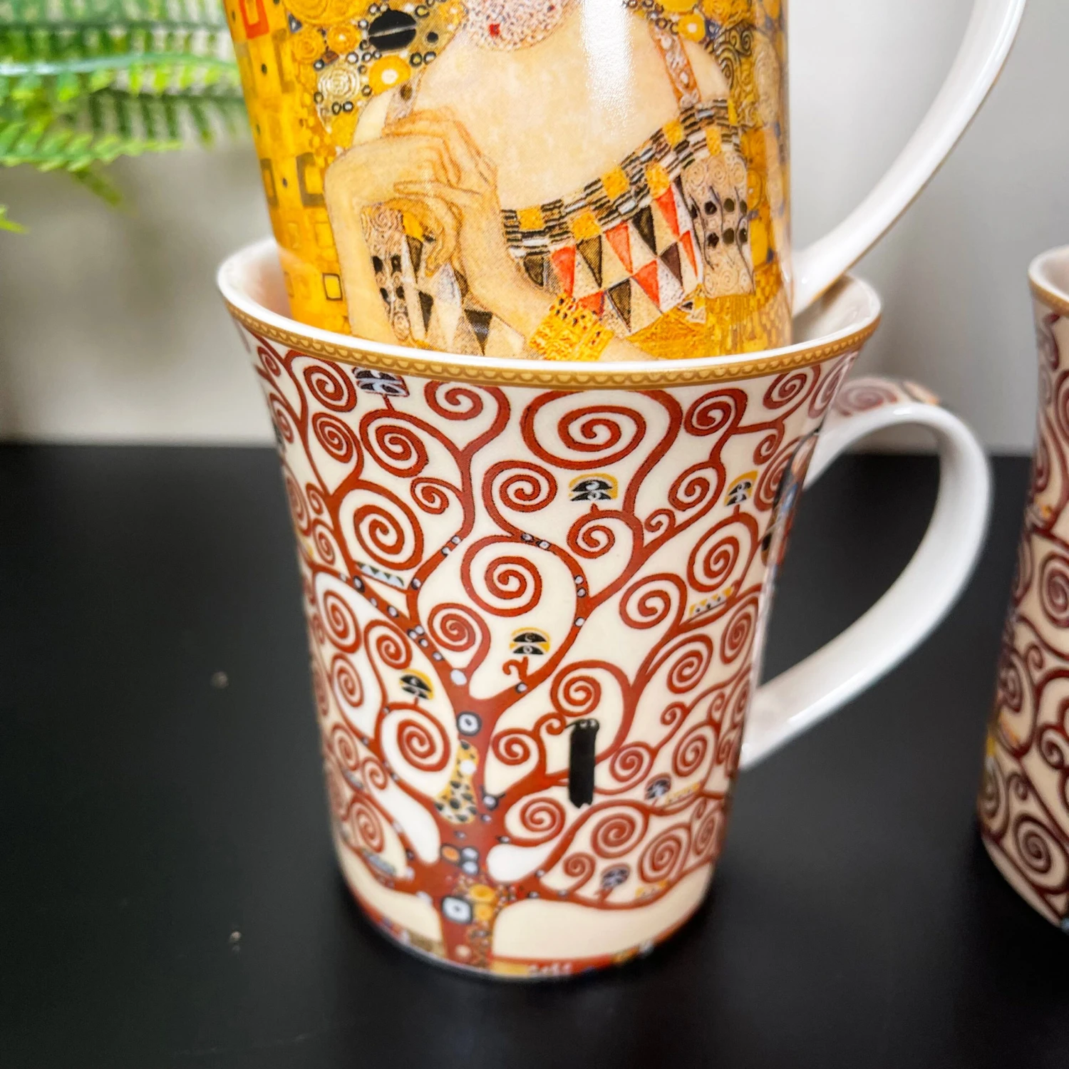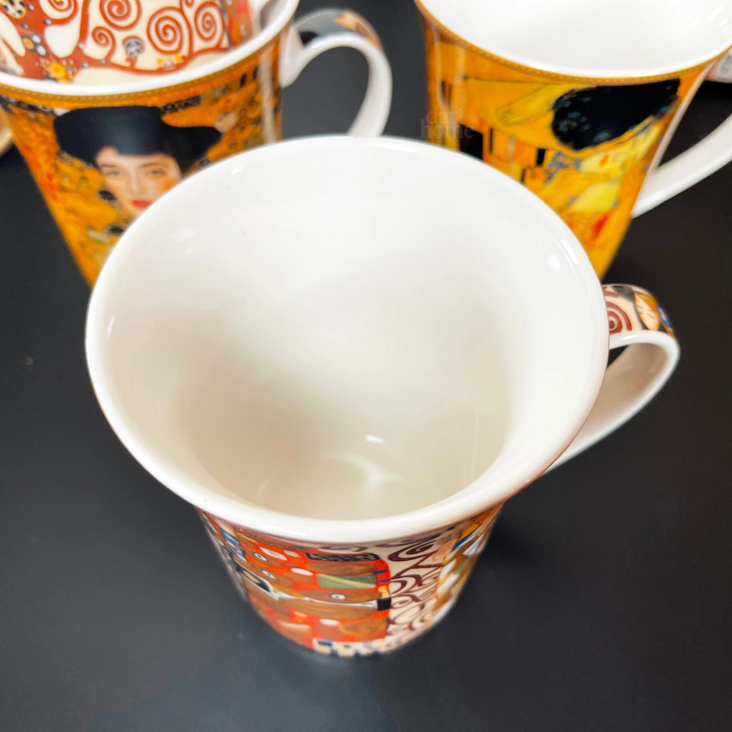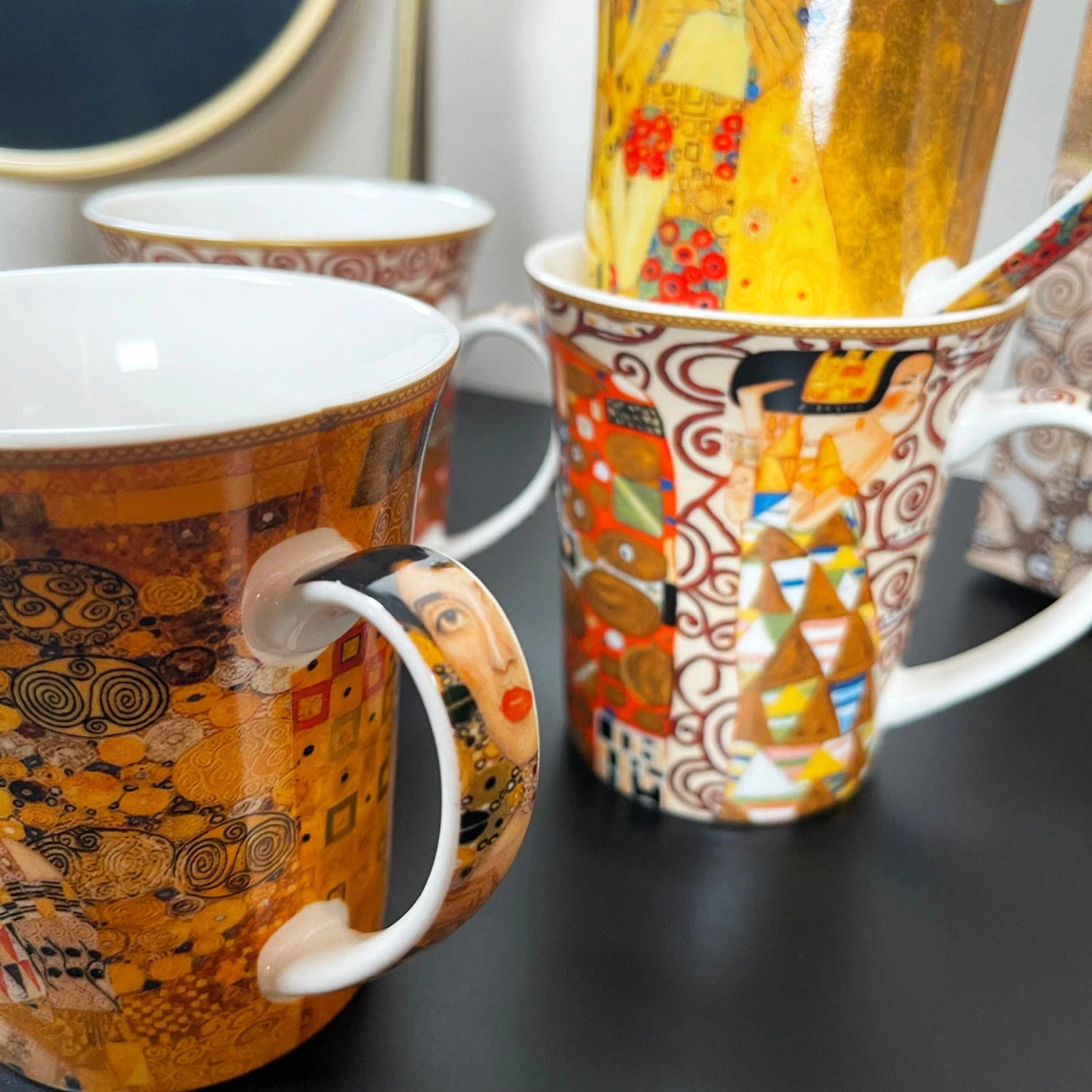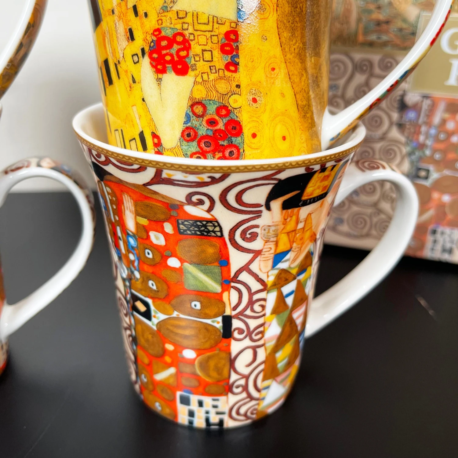 Enjoy a midday coffee to get you through the day with your favourite artists work displayed to view. These Gustav Klimt themed fine china mugs showcase four of Klimts most famous paintings. They offer approximately a 400ml capacity and display eye-catching bright colours. This is a round mug set of 4 which come gift boxed made from fine china and are microwave and dishwasher safe.