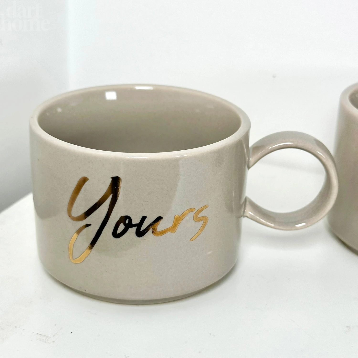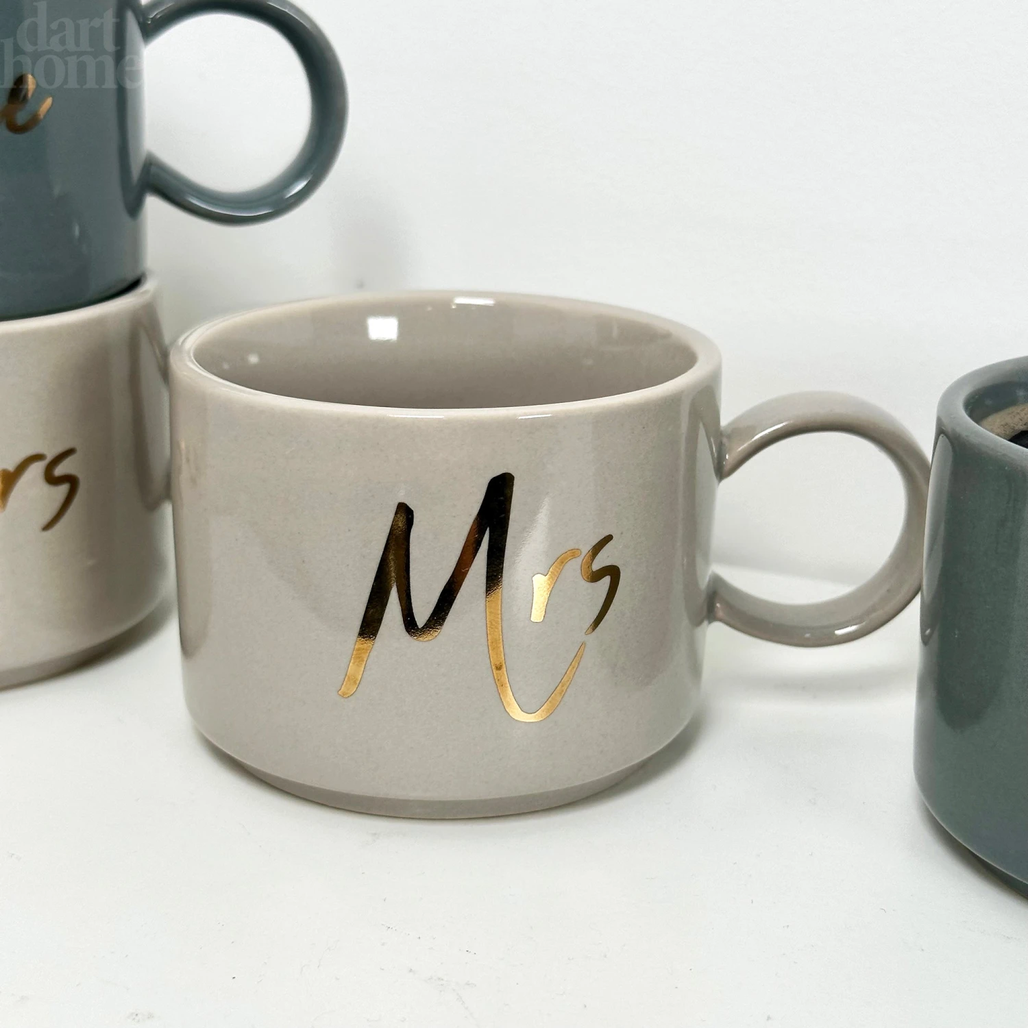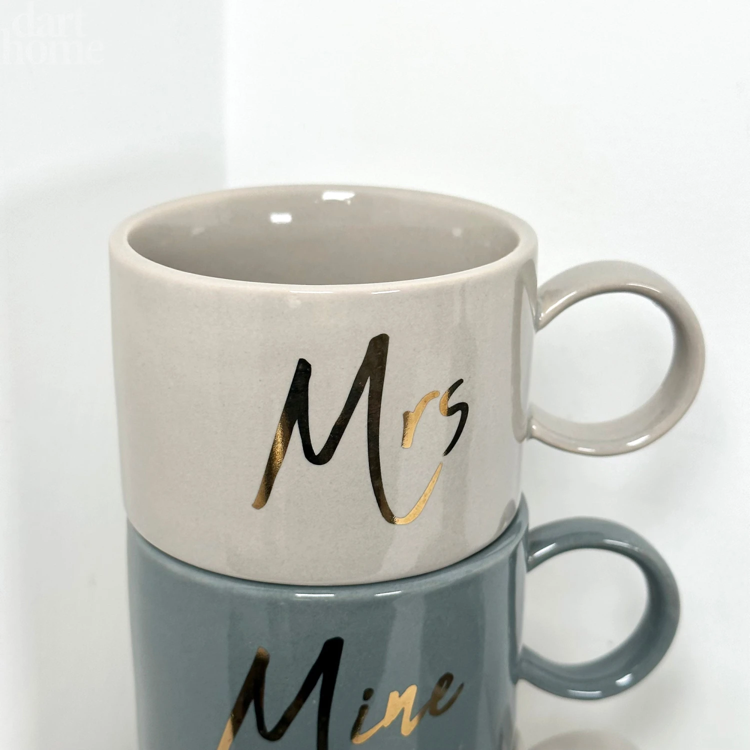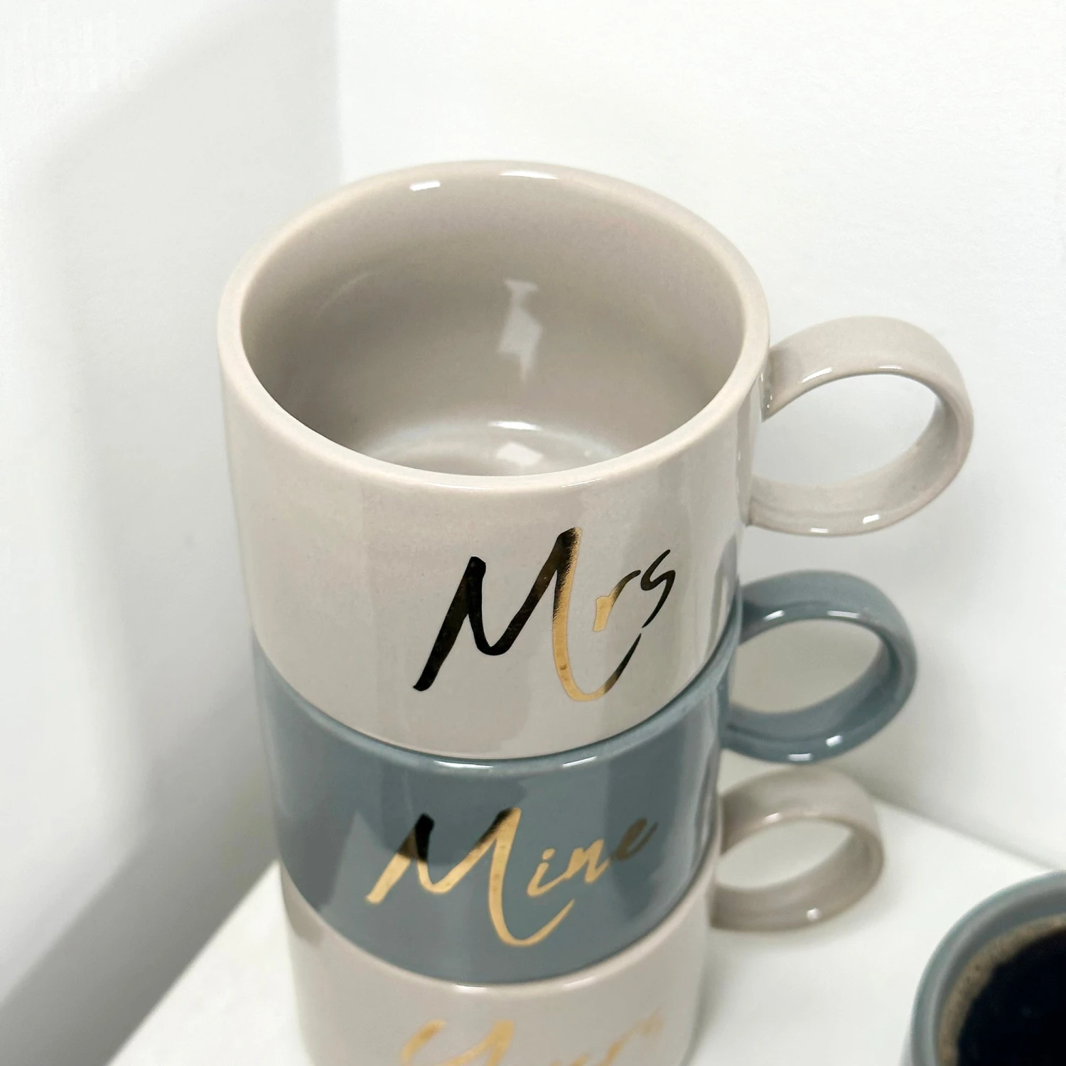 The perfect wedding gift for any newly married couple. This set of 4 stacking mugs feature a mr and mrs set along with a mine and yours set, labelled with a modern gold script font. With a 200ml capacity, these mugs are perfect for your matching morning coffee. Hand wash only.