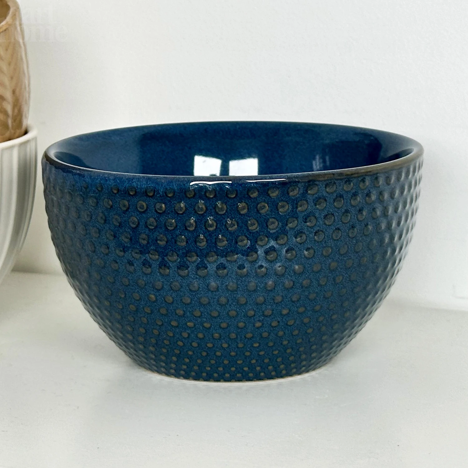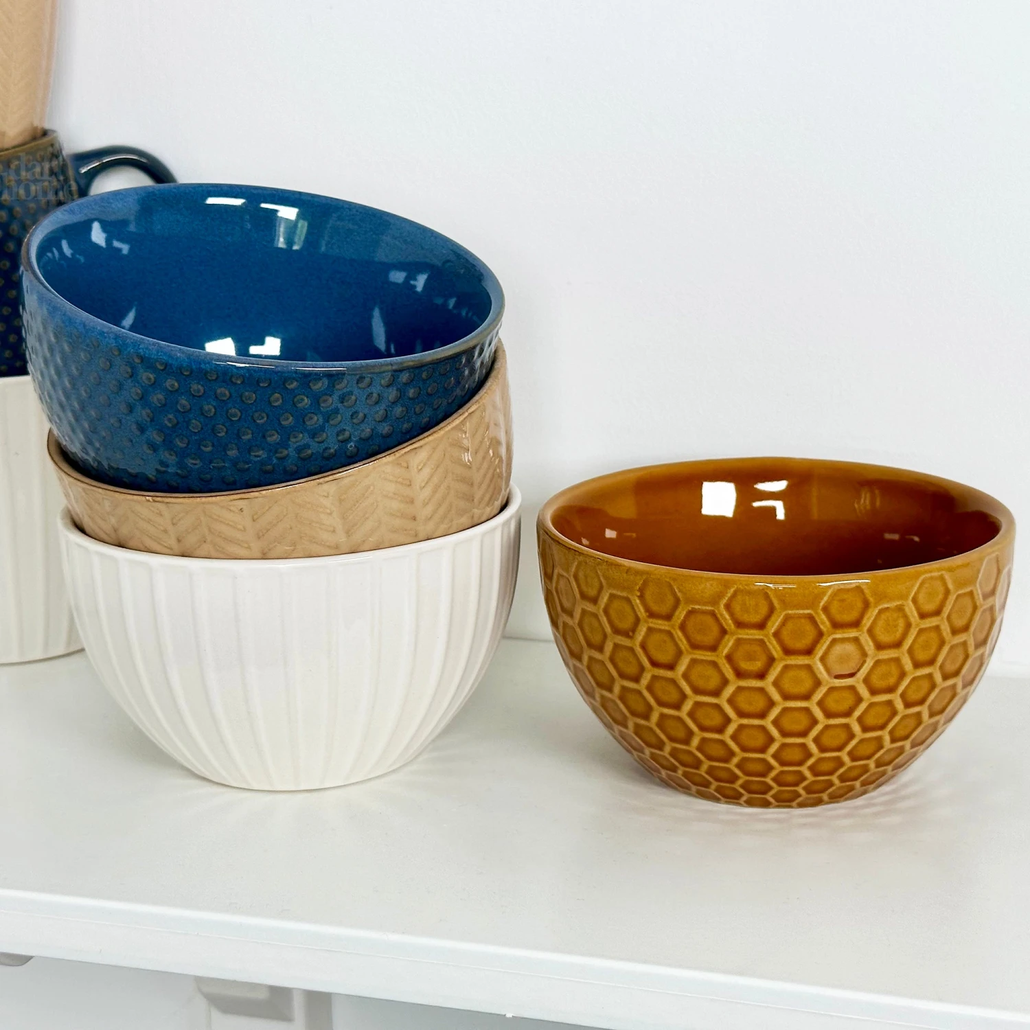 This set of 4 stoneware snack bowls is ideal for serving dips and snacks in style. Featuring a unique honeycomb, dotted, striped and herringbone pattern, these reactive glaze-patterned 300ml bowls are sure to impress. The perfect addition to any kitchen!