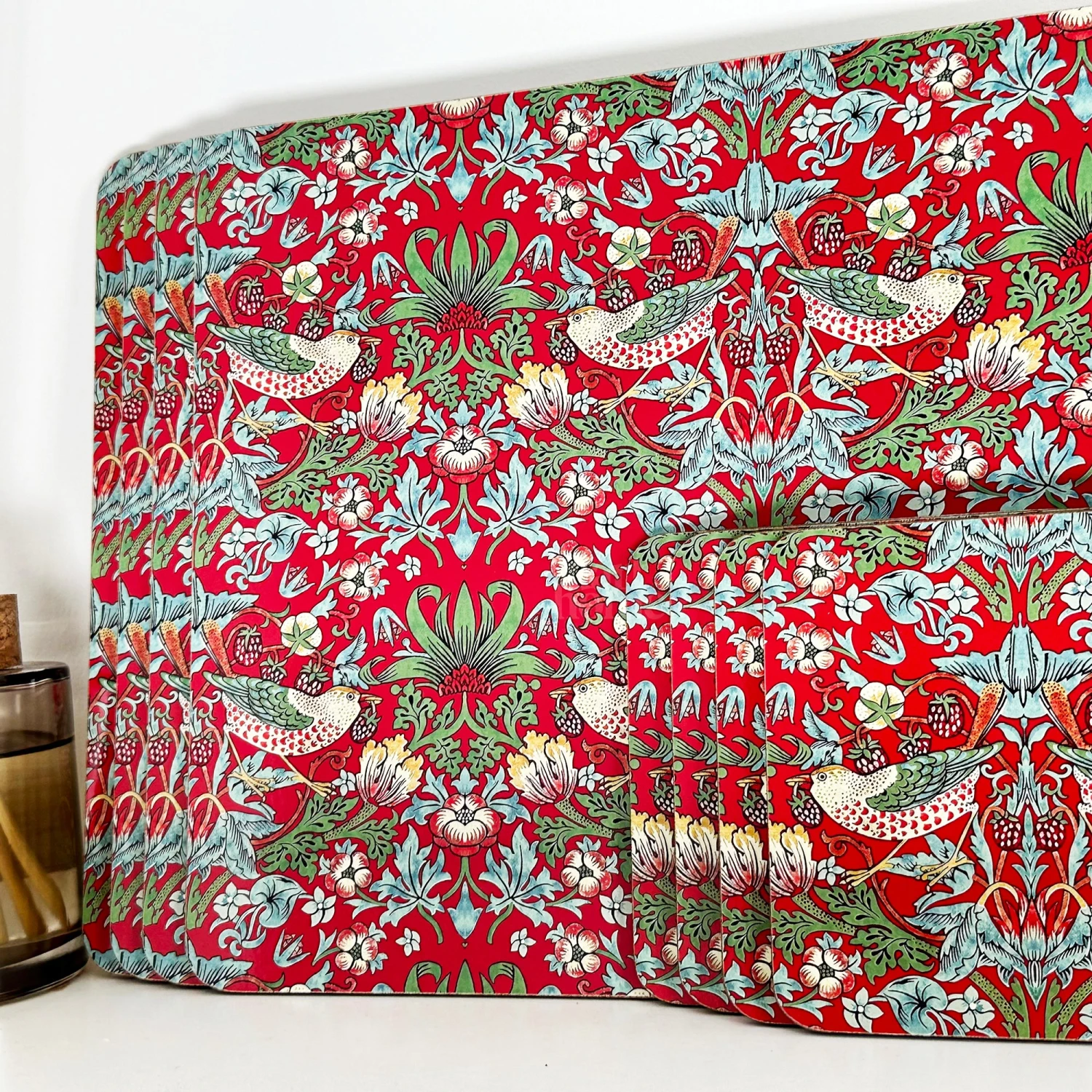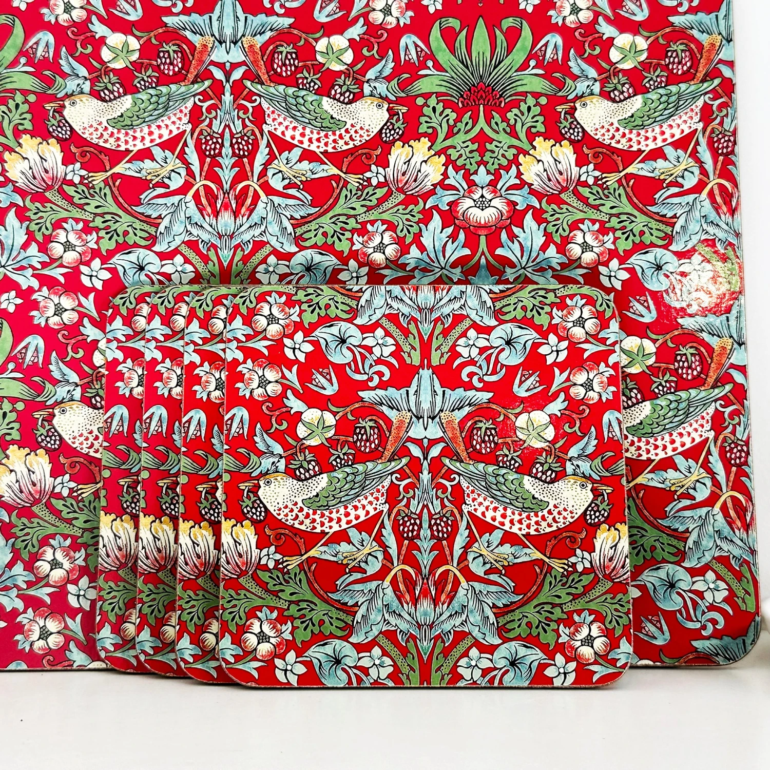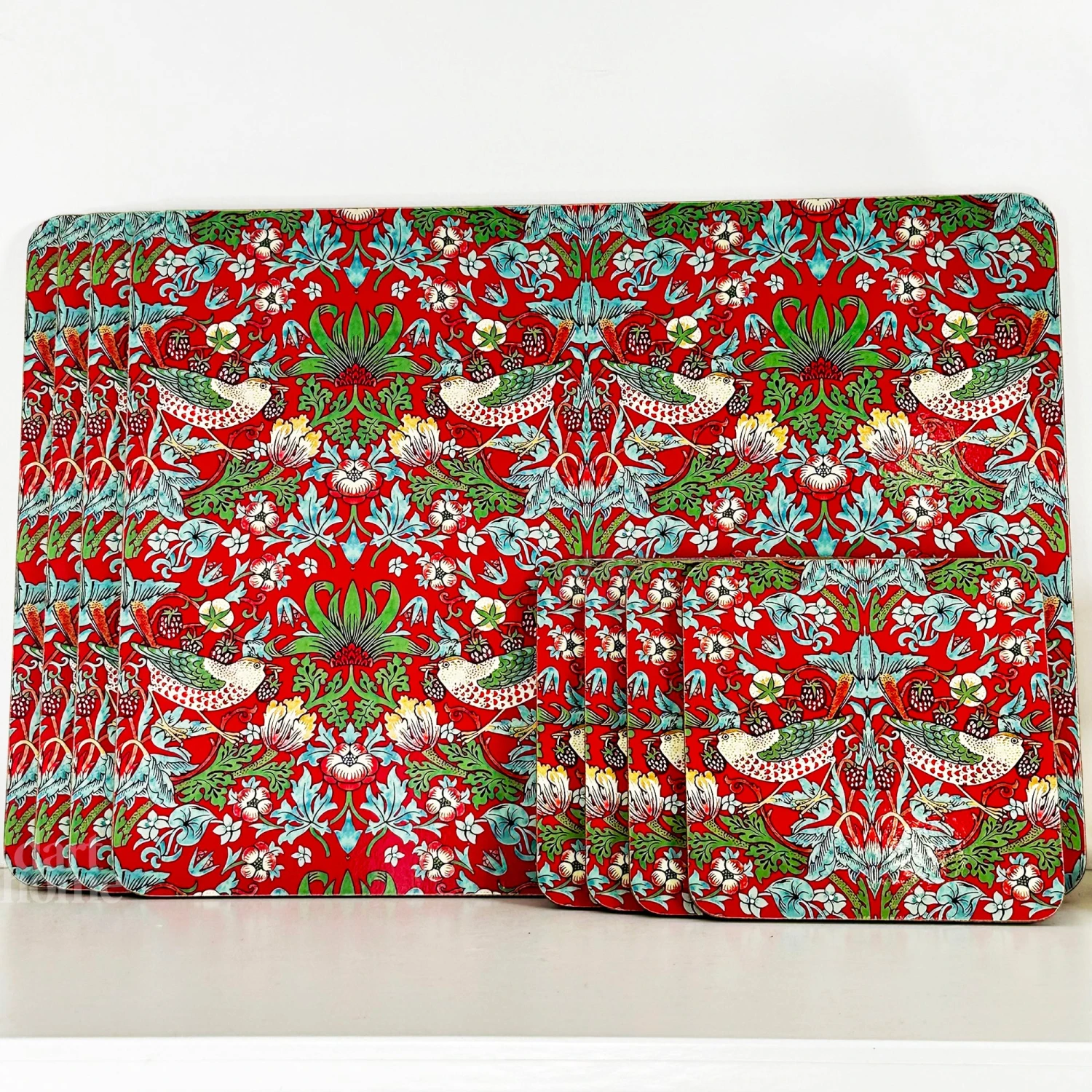 Practical items don’t have to be dull as these cork William Morris placemats and coasters prove. Showcasing the classic, colourful Strawberry Thief design, this stylish set of 8 easy to clean, stain resistant kitchen tableware featuring 4x coasters and 4x placemats are ideal for use when hosting parties or protecting surfaces every day.