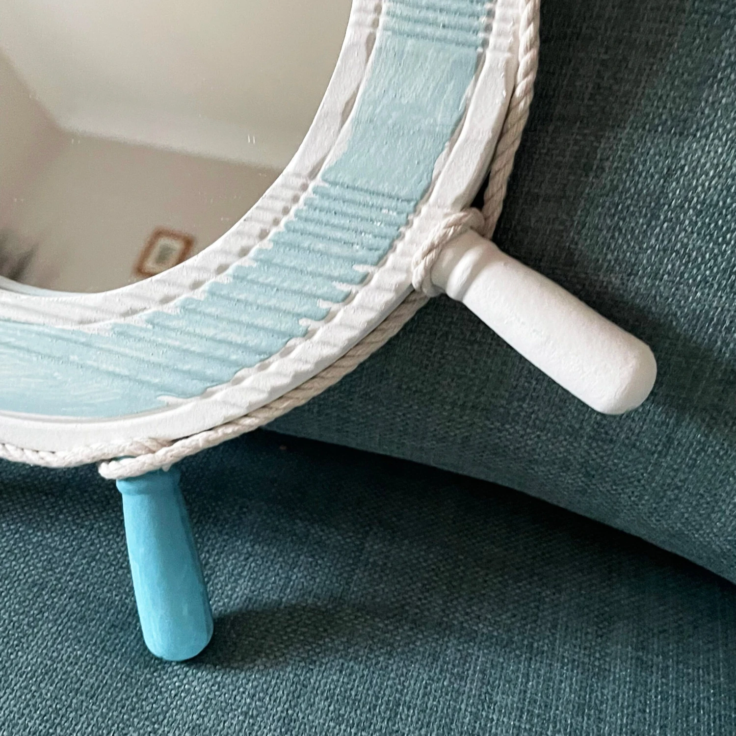Novelty round 19cm diameter wall mirror in a classic 41cm diameter ships wheel design frame. Distressed coloured wooden frame with nautical and seaside themed decorations around the frame. Great for bathroom decorative use.