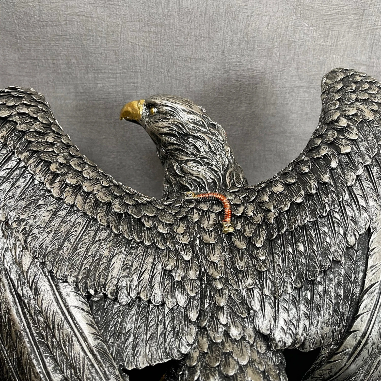 This is a fantastic steampunk themed resin large wide open winged eagle statue. It is finished with a distressed silver colour with bronze and golden finished mechanical parts. Brilliant gift idea for the sci-fi, gothic and fantasy lovers out there.