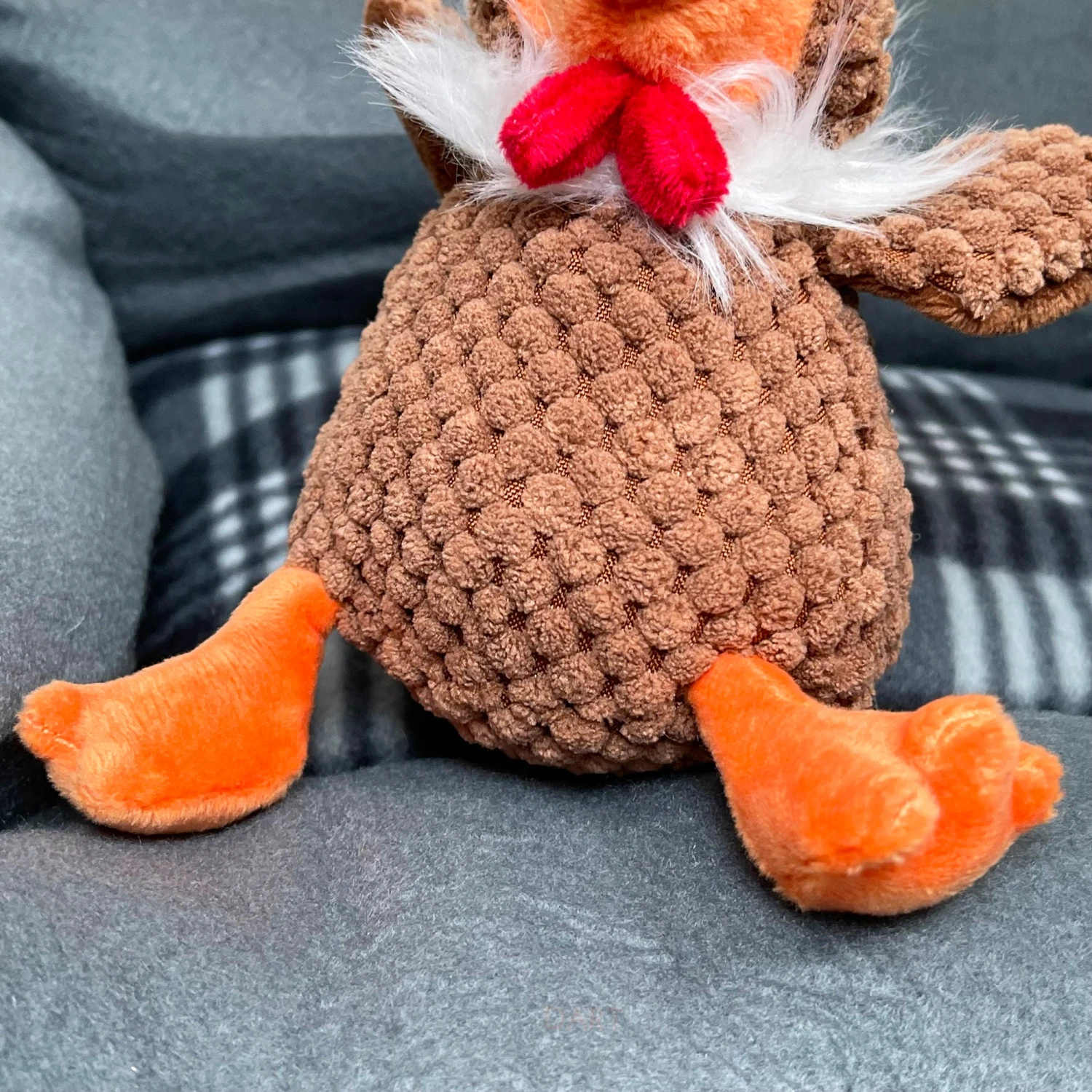 Features: Animated, Soft Plush, Smiley Face, Squeaky, Brown Mini Chicken, Orange Feet, Round