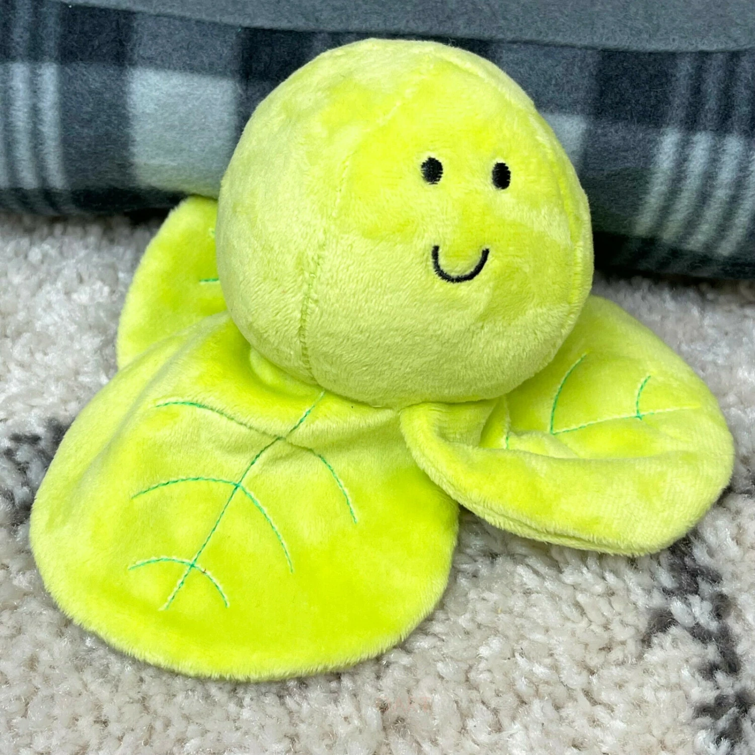 Features: Animated, Soft Plush, Smiley Face, Green Leaves, Squeaky, Bright Green Brussel Sprout