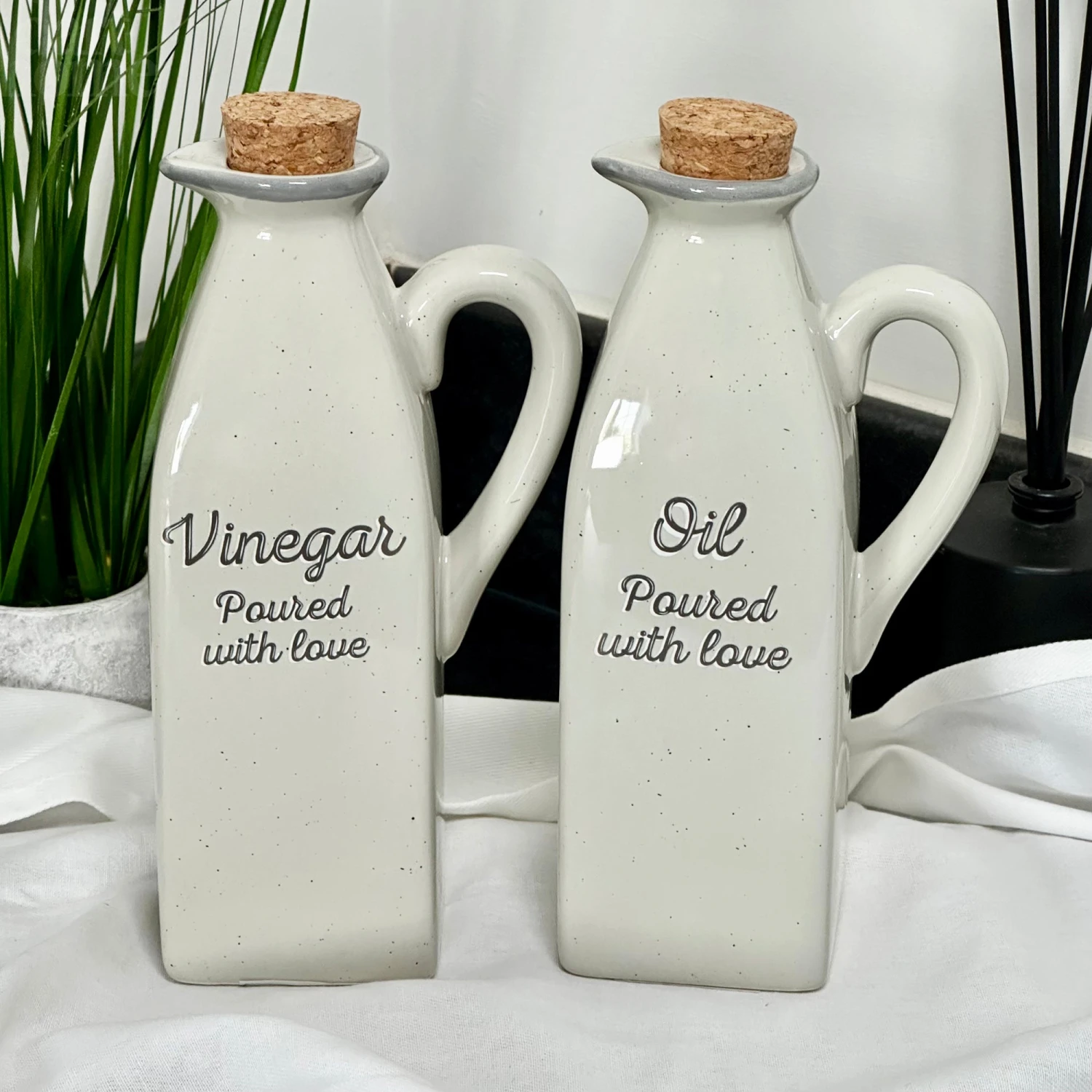 This kitchen set includes an oil bottle and a vinegar bottle with a matching ‘Powered With Love’ Design, boasting a speckled antique grey finish and completed with a cork bottle stopper.
