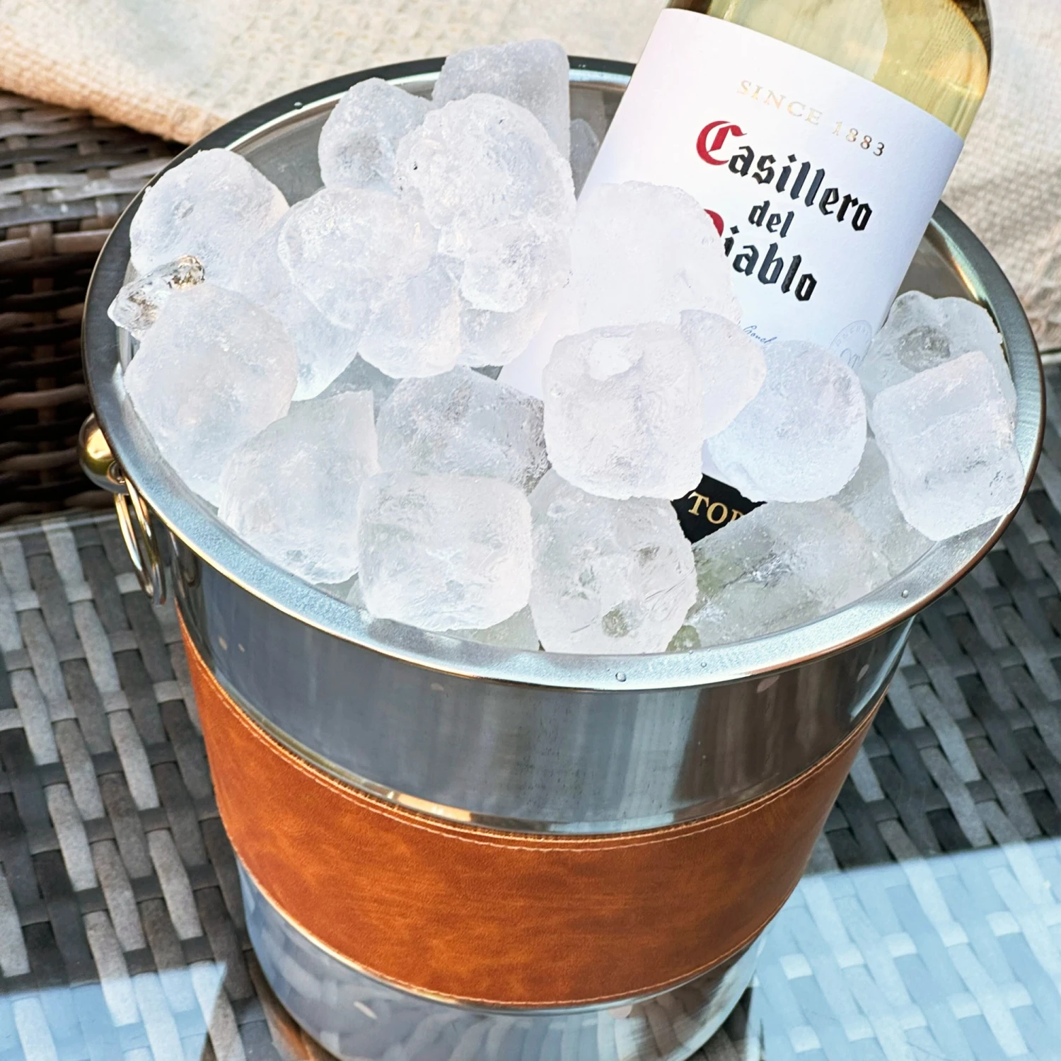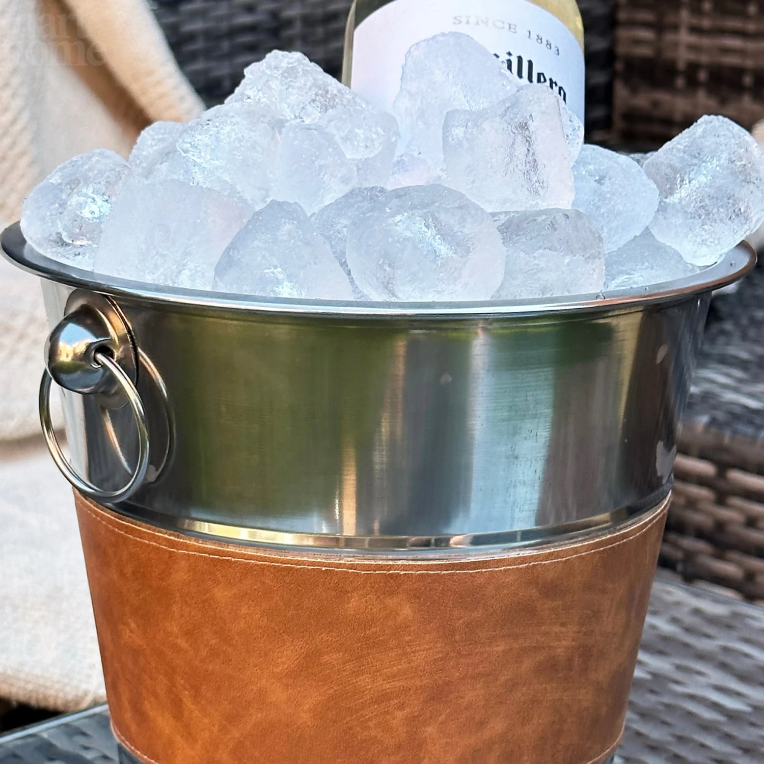This stainless steel champagne cooler showcases a shiny silver design with an eco-friendly brown faux leather detail in the centre. Perfect for multiple beer, wine and champagne bottle storage in your garden when enjoying a nice hot summers day.