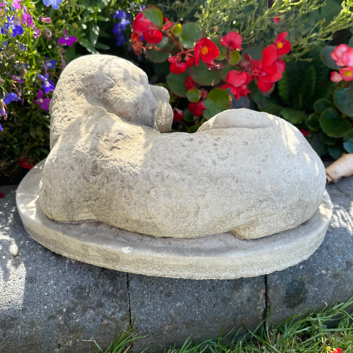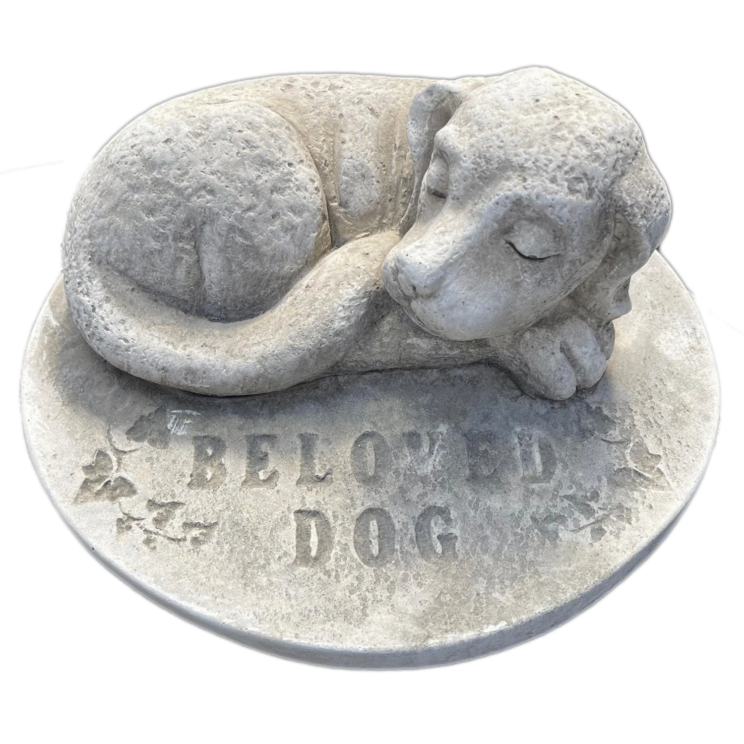 Heavyweight sleeping dog memorial ornament with engraved text reading ‘Beloved Dog’. Resting dog on an oval base completed with ivy flower decorations. Made from stone in the UK. Perfect ornament for a garden or memorial grave.
