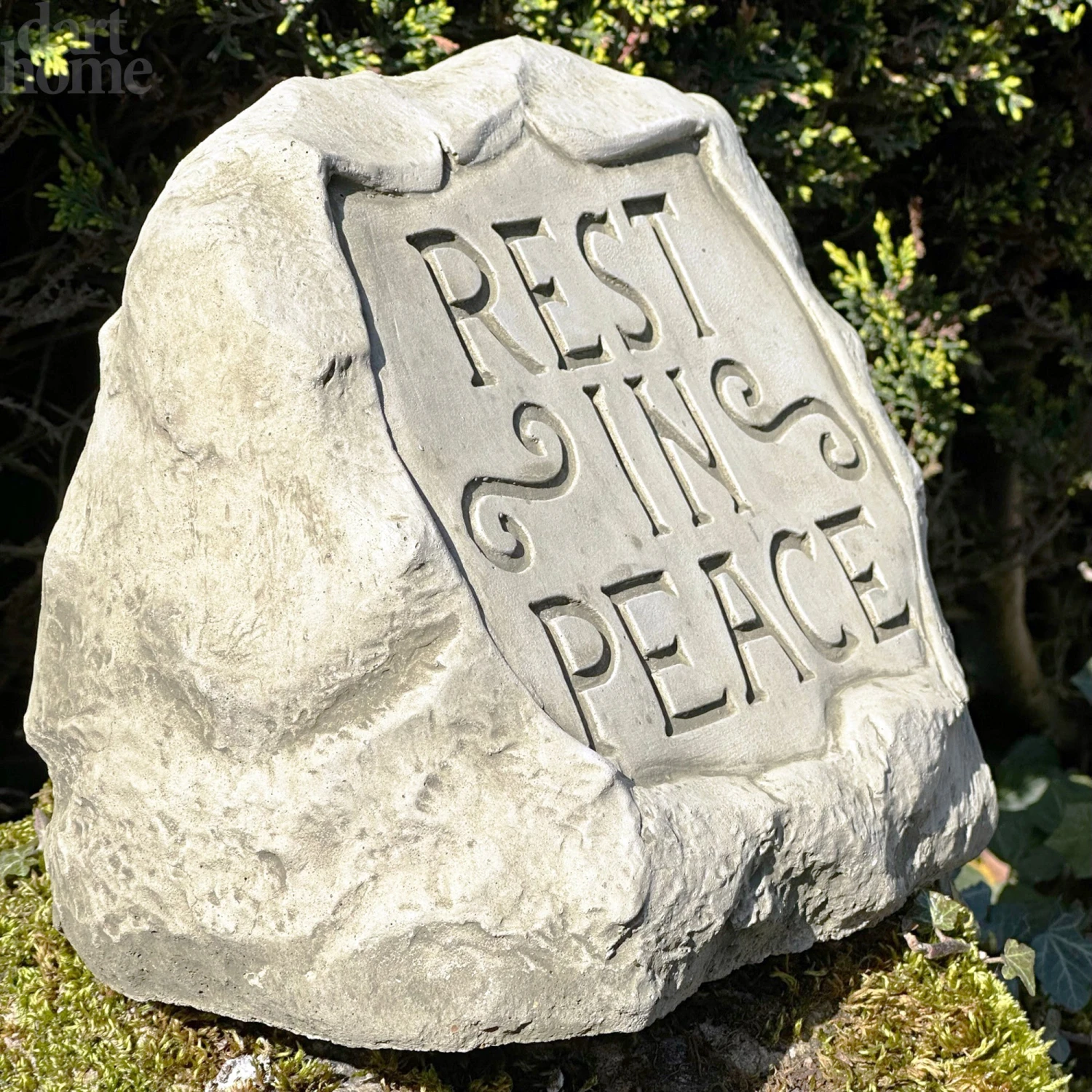 Heavyweight memorial grave sculpture, featuring a gothic rest in peace design and made from reconstituted stone in the United Kingdom. In a natural antique grey finish, this heavy duty Rest In Peace stone block is suitable for year-round decoration. It is a weatherproof and frost resistant statue.