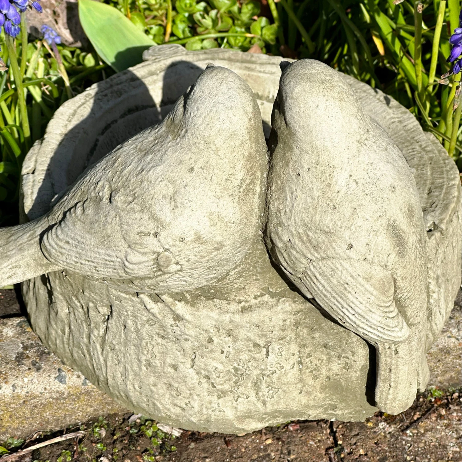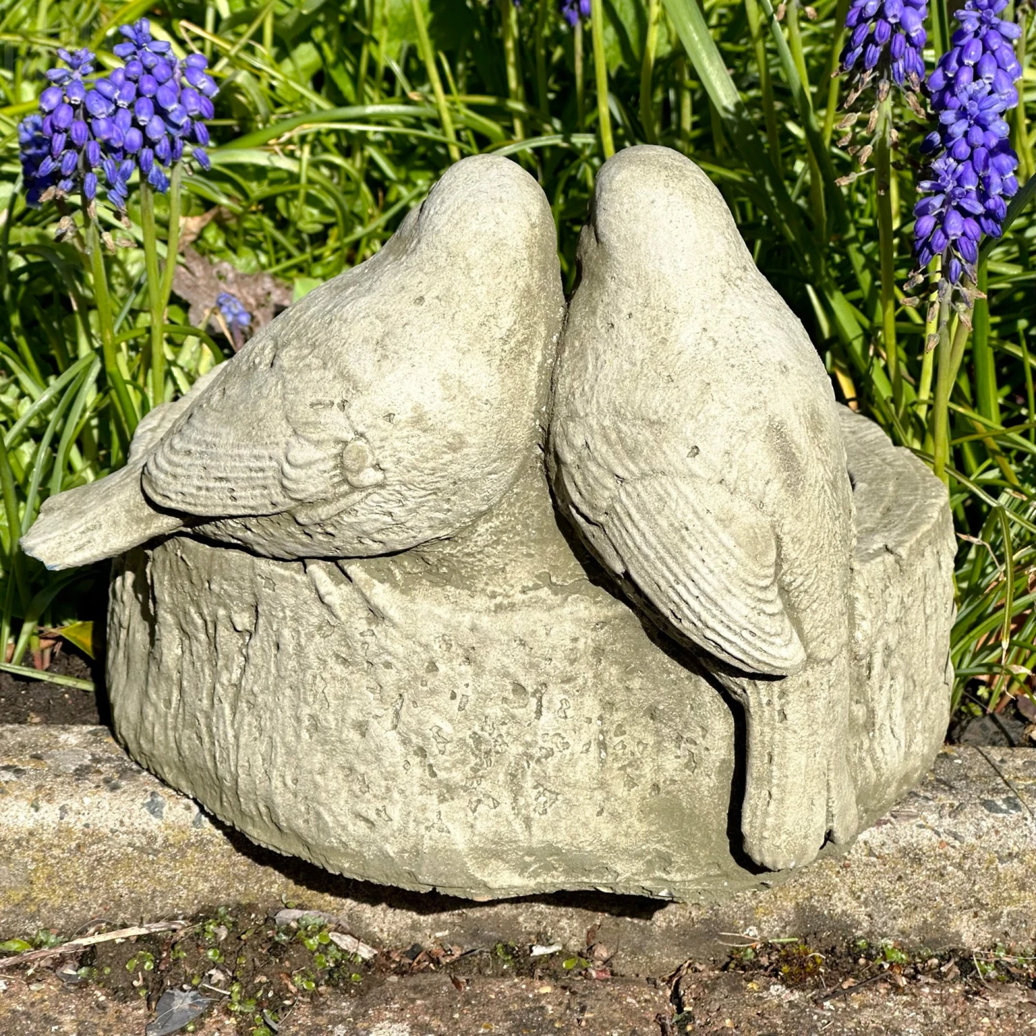 Hand crafted in the United Kingdom, this garden bird feeder made from Reconstituted Stone and featuring a robin pair perched on a round log design. This seed feeding station with an antique grey that will be a focal point of your garden.