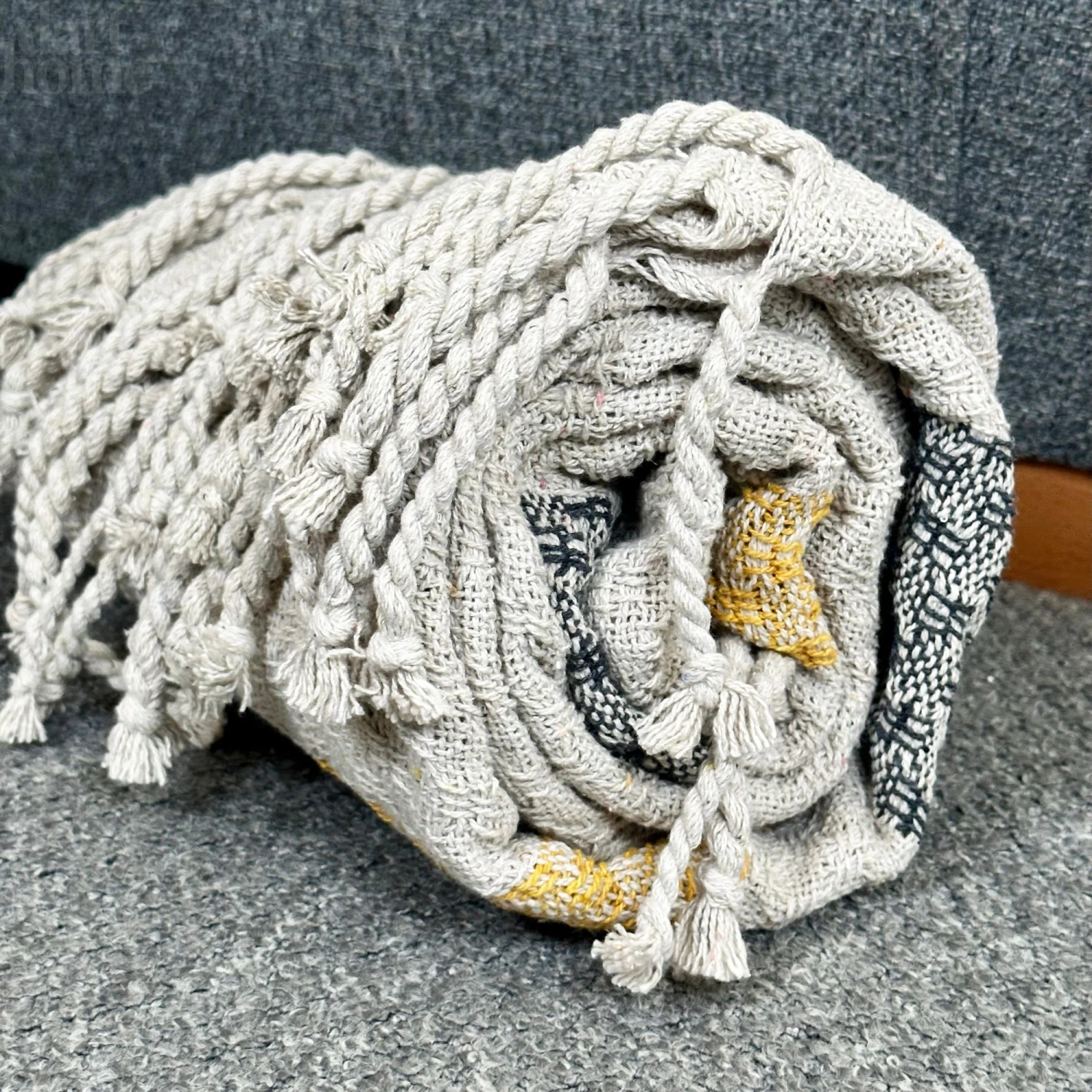 This soft cotton throw comes rolled and is perfect for warming you and your loved one up on a chilly evening. Perfect for snuggling and watching a film! A timeless striped design made with woven cotton that add a lovely contrast and to finish there is a stunning tassel fringe for texture. The neutrality of the colours allows for easy styling in any room, especially to use across the bed or sofa.