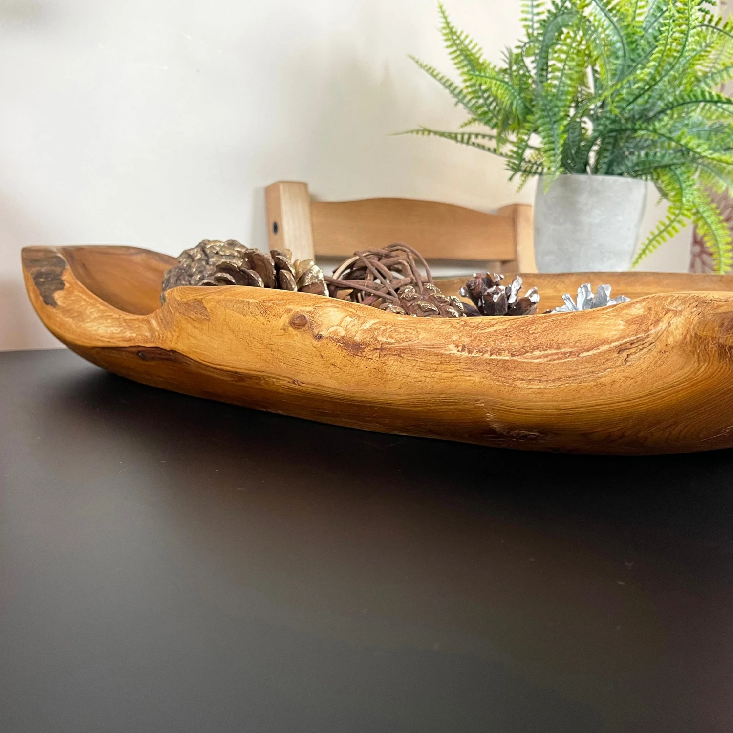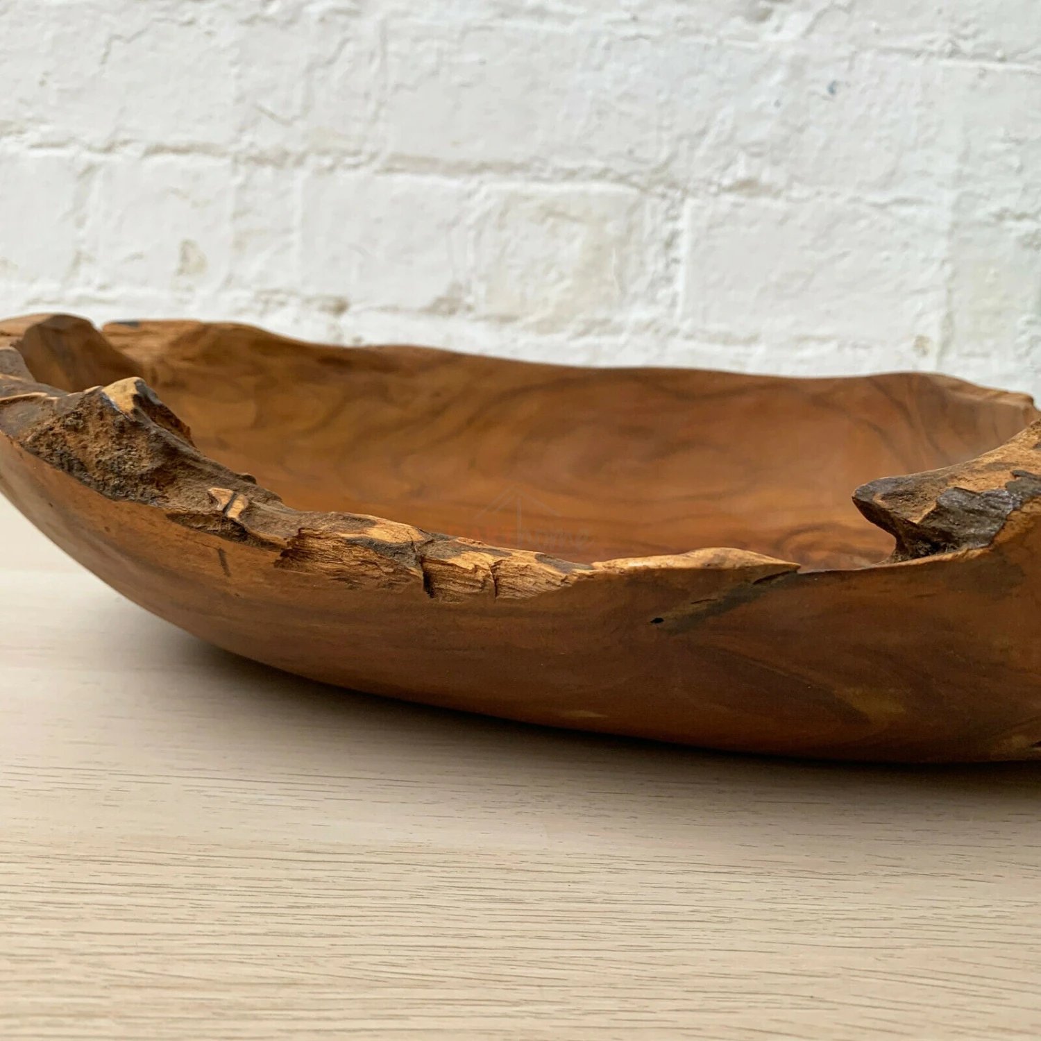 Add a vintage touch to your next get together. This beautiful root wood long bowl is ideal for fruit and for decorative purposes.