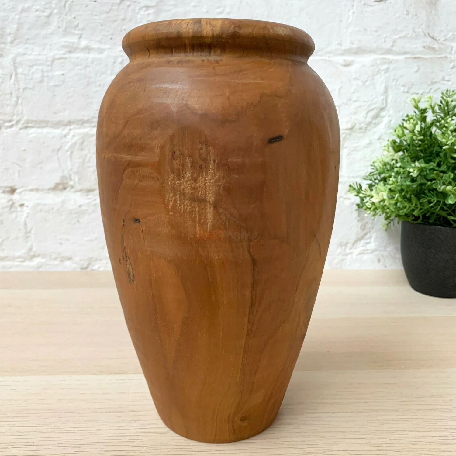 This beautiful vintage and rustic natural solid teak wood urn shaped mini vase will be a great decorative, neutral, classy plant pot that will look perfect in your home. This is an indoor piece ideal for small colorful flower arrangements.