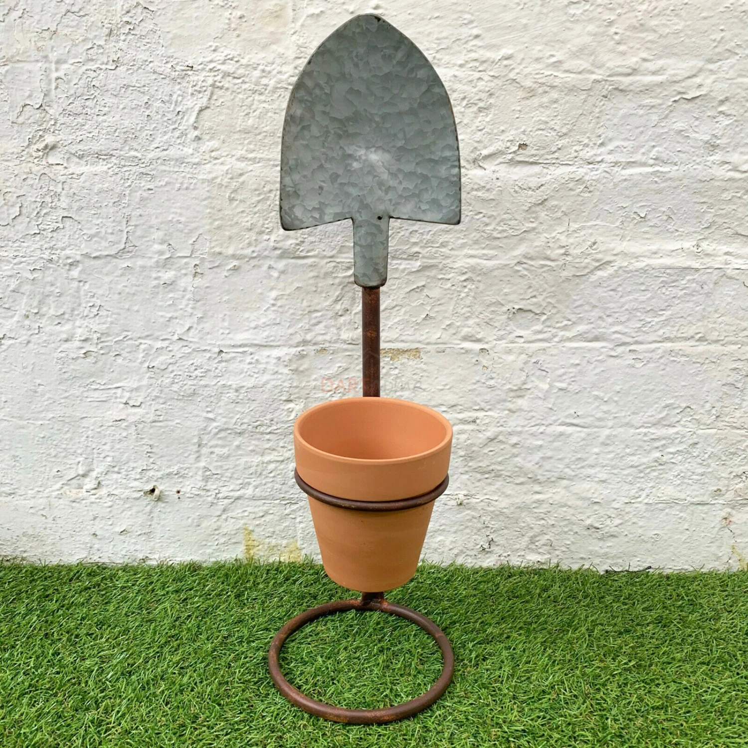 These charming industrial style plant pot holders come in a spade and rake design with a round space for a terracotta plant pot.