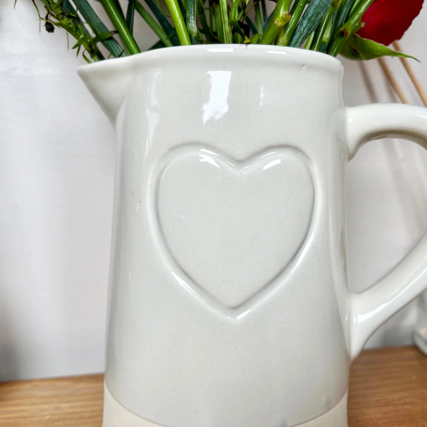 This contemporary country style jug vase with faded grey love heart detail and grey trims, this jug vase is perfect for holding floral arrangements and will only enhance your wedding or kitchen table decoration.