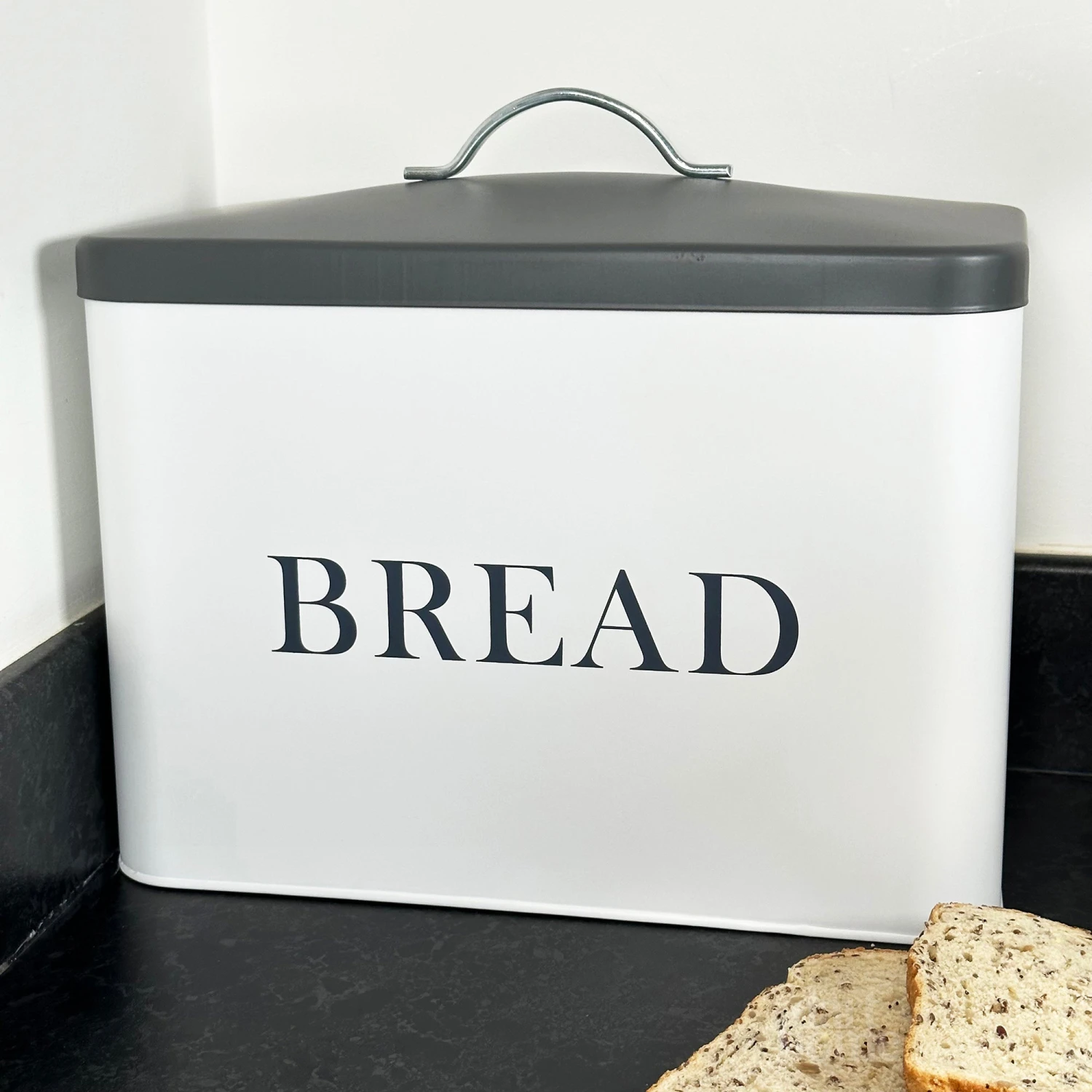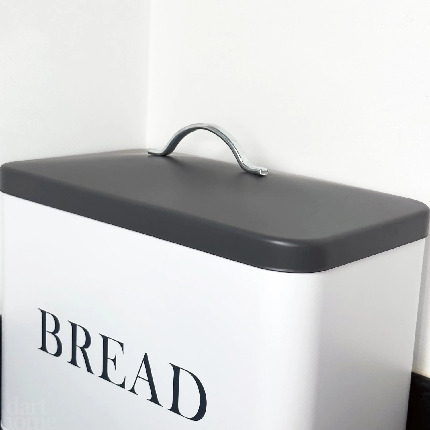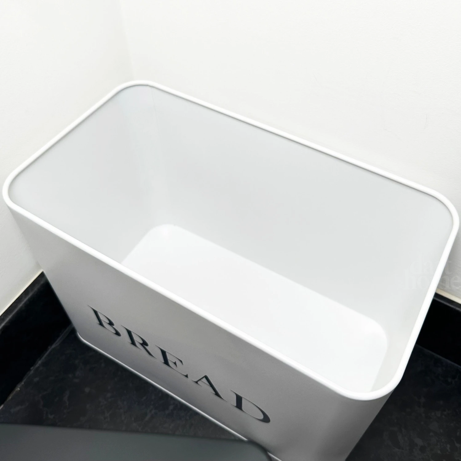 This rectangular bread bin is a classic style storage solution for your kitchen. This storage tin is made from quality metal with a white and grey finish. It is equipped with an airtight lid with a grey BREAD label on the front.