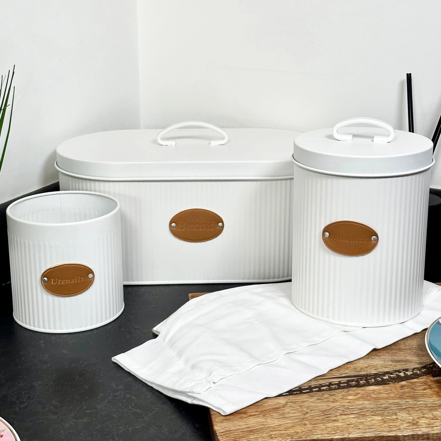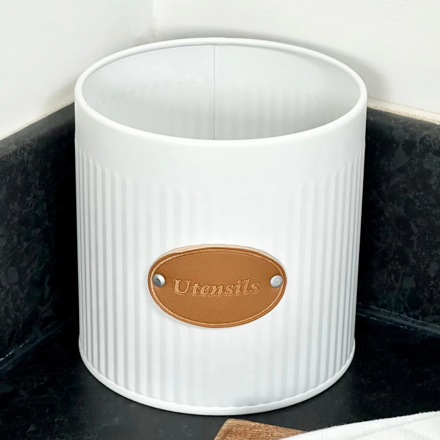 Store your kitchen utensils in style with this modern white ribbed utensil pot. The faux leather label and metal accents add a touch of class and will make a lasting impression in your kitchen. Keep your countertop neat and organized!