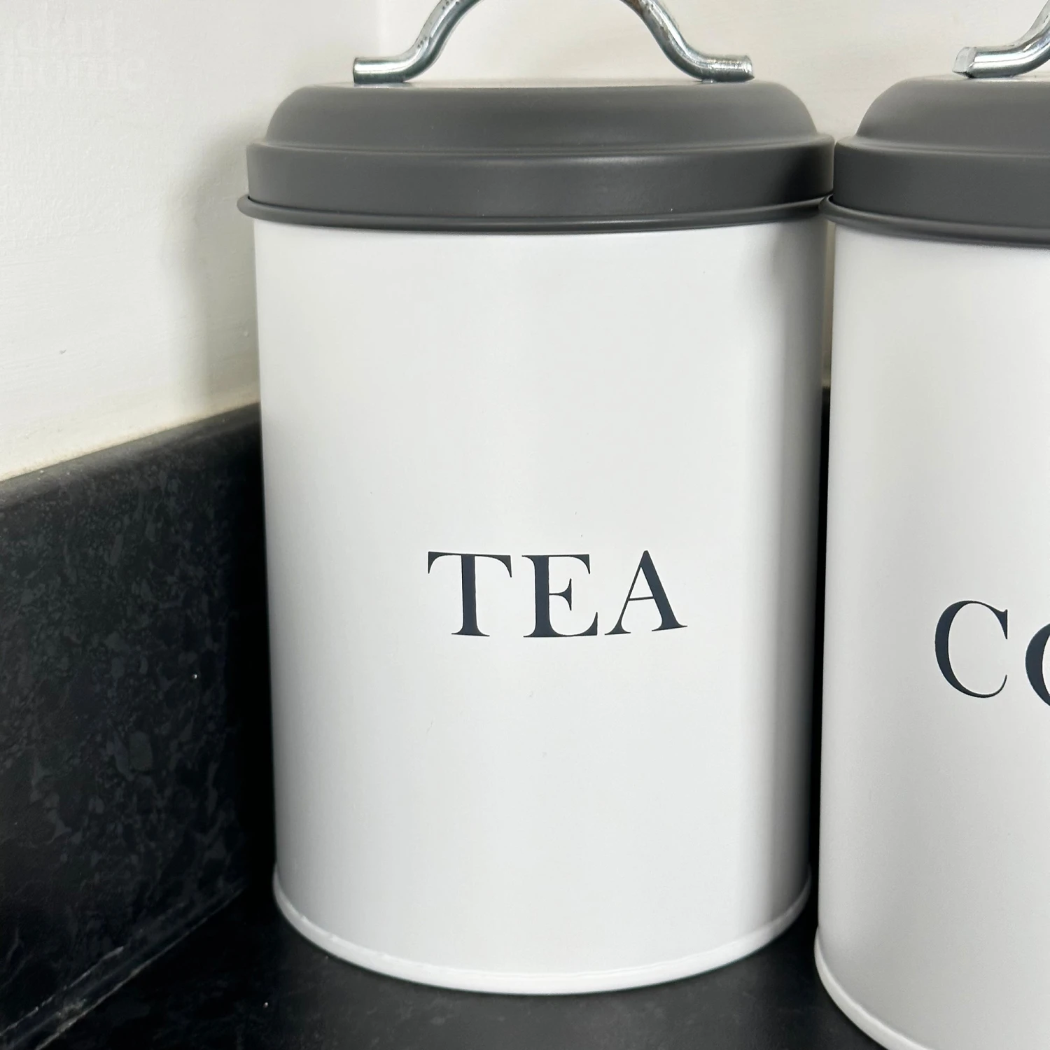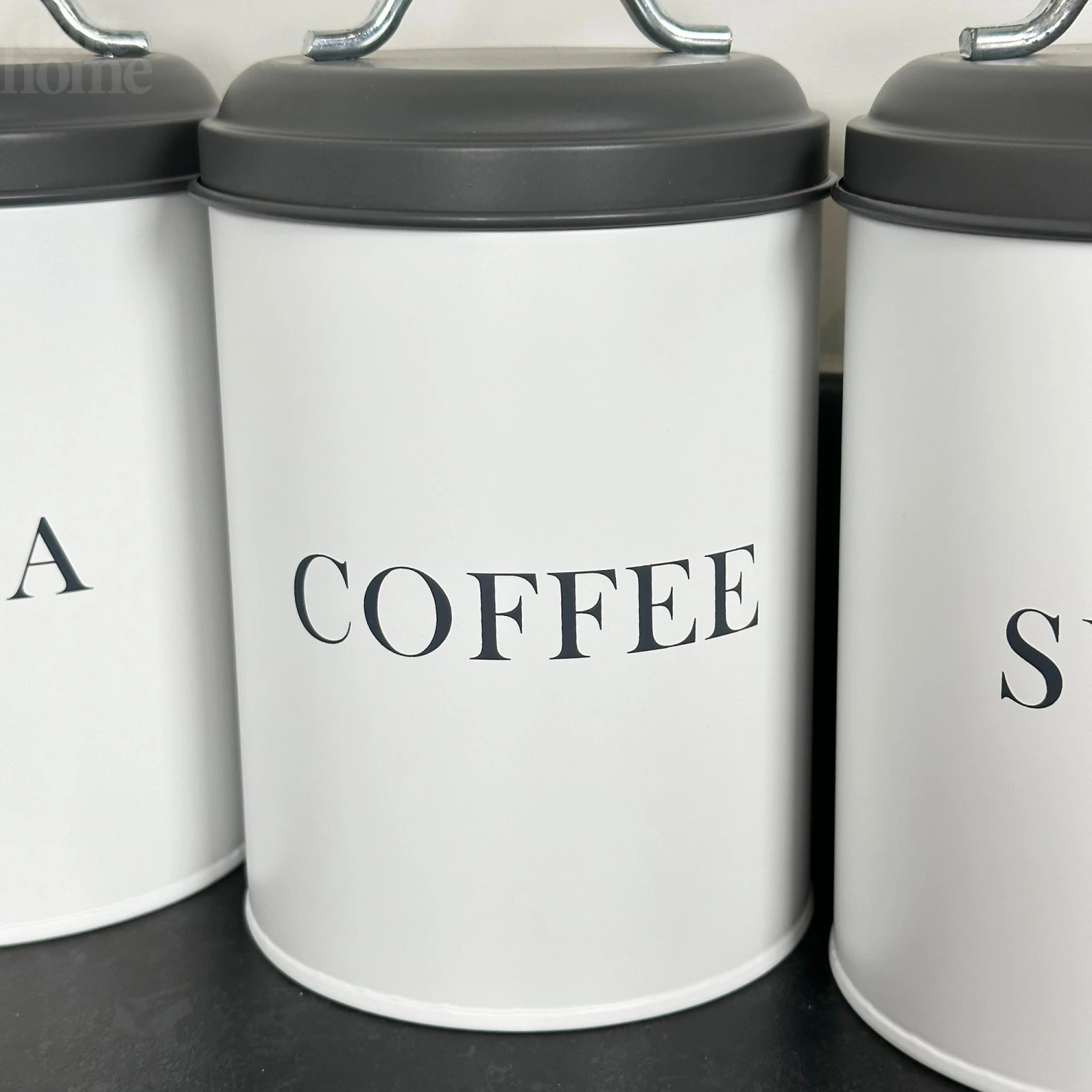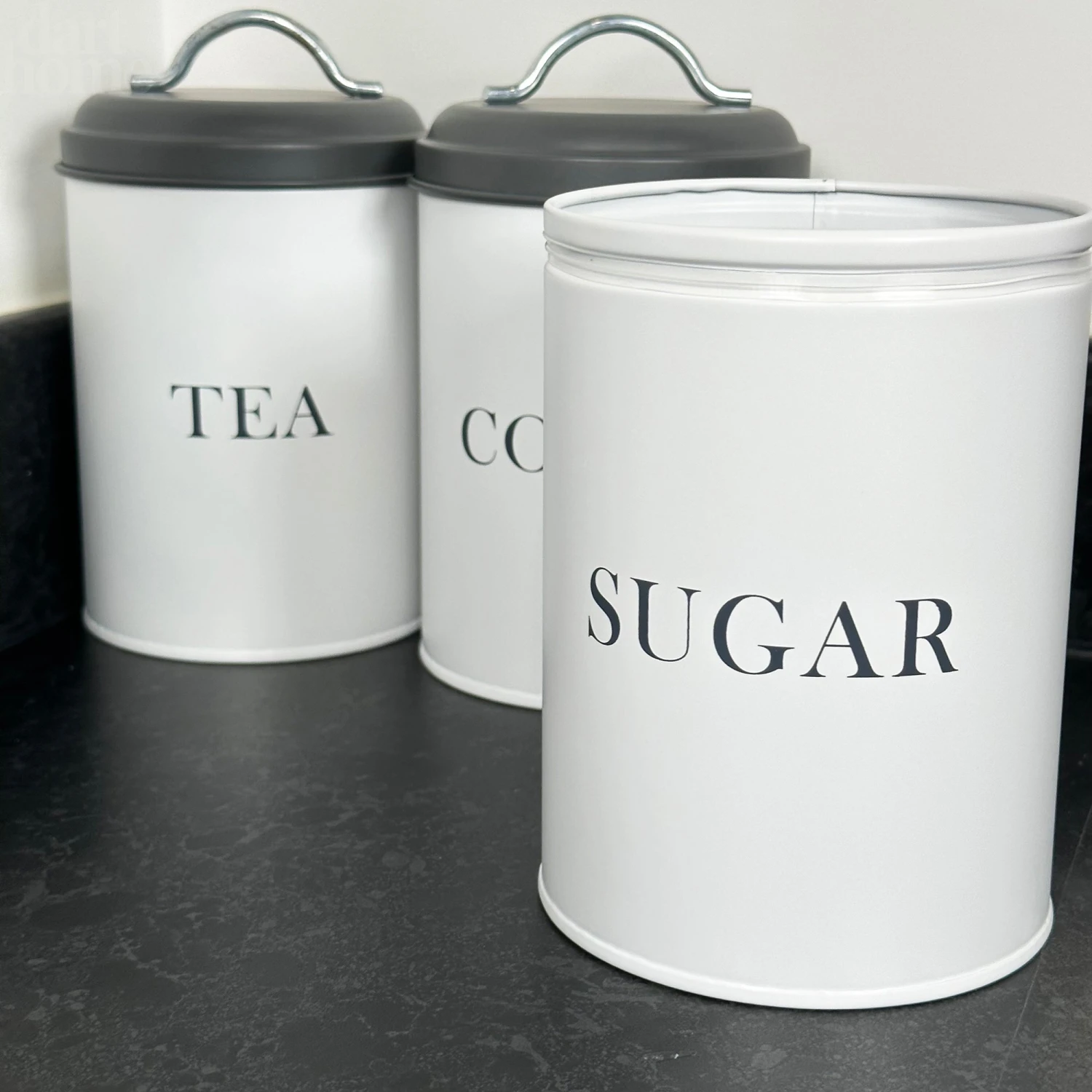 In a classic modern style, this set of 3 matt white storage jars with grey lids are designed to hold your tea bags, coffee and sugar is a piece that needs to be styled in your kitchen immediately. Comes with grey airtight lids with a chrome handle and grey labels. These are round storage jars that your kitchen decor has to have.