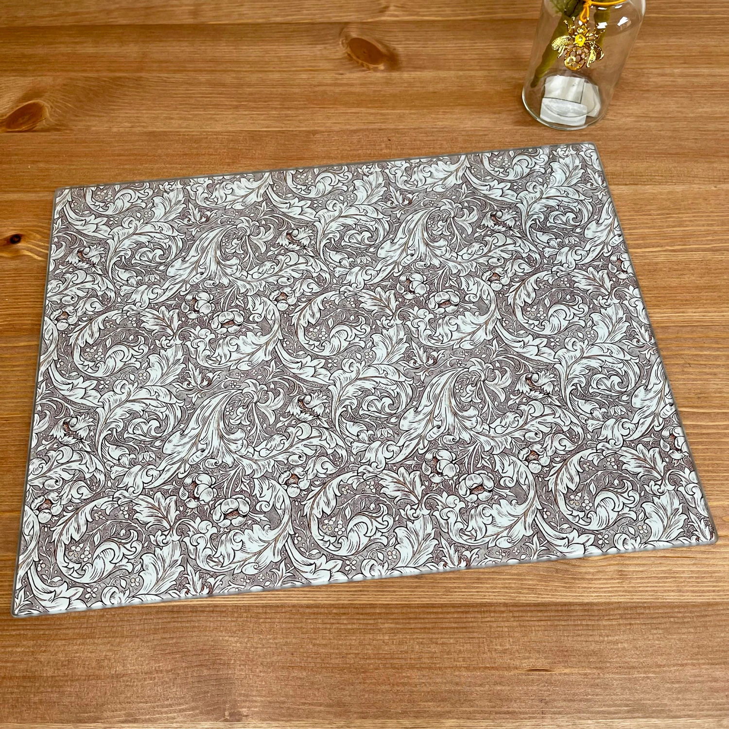 Glass cutting board featuring a classic William Morris art printed design, specifically the bachelors button design. Will be a great kitchen worktop saver and protector when cutting and cooking.