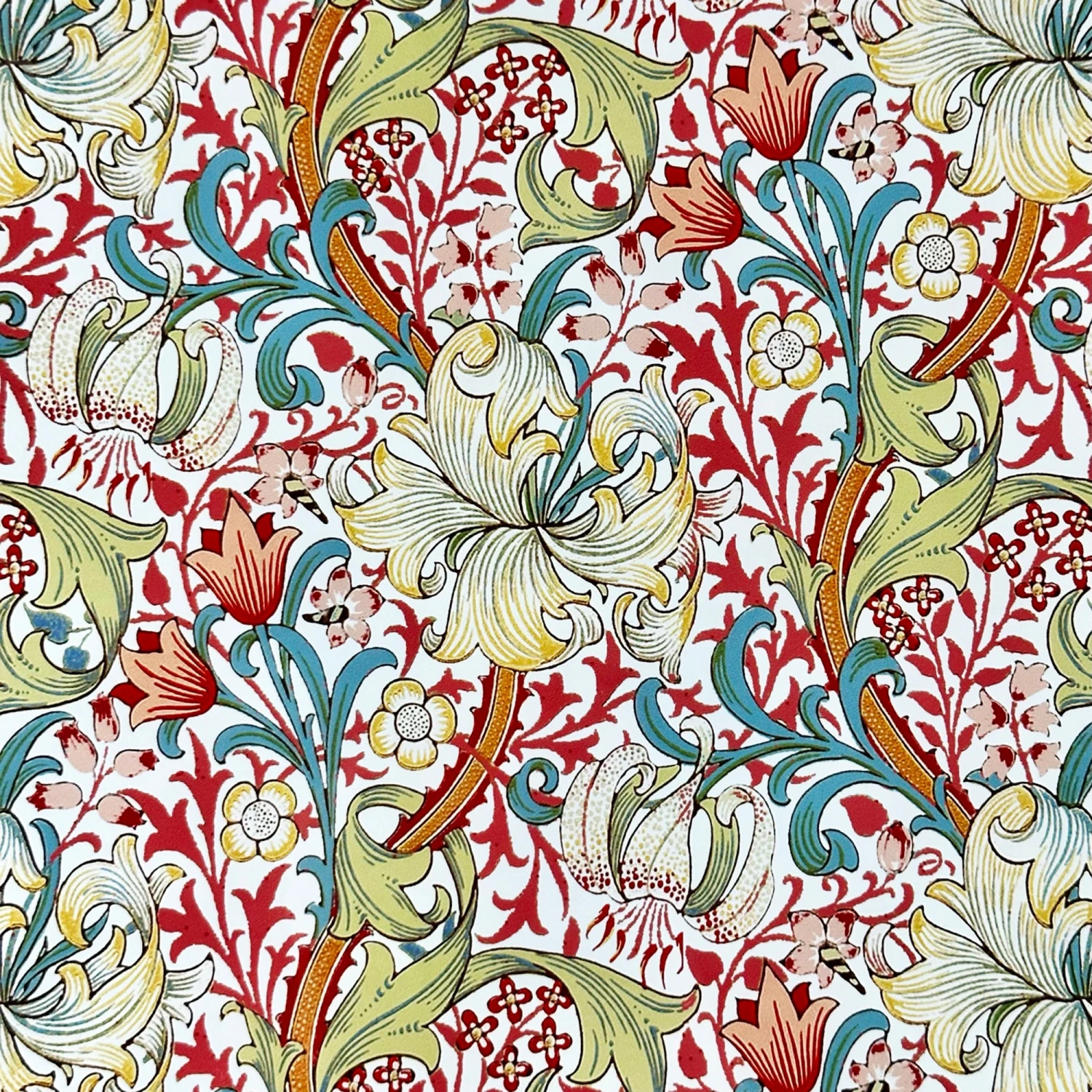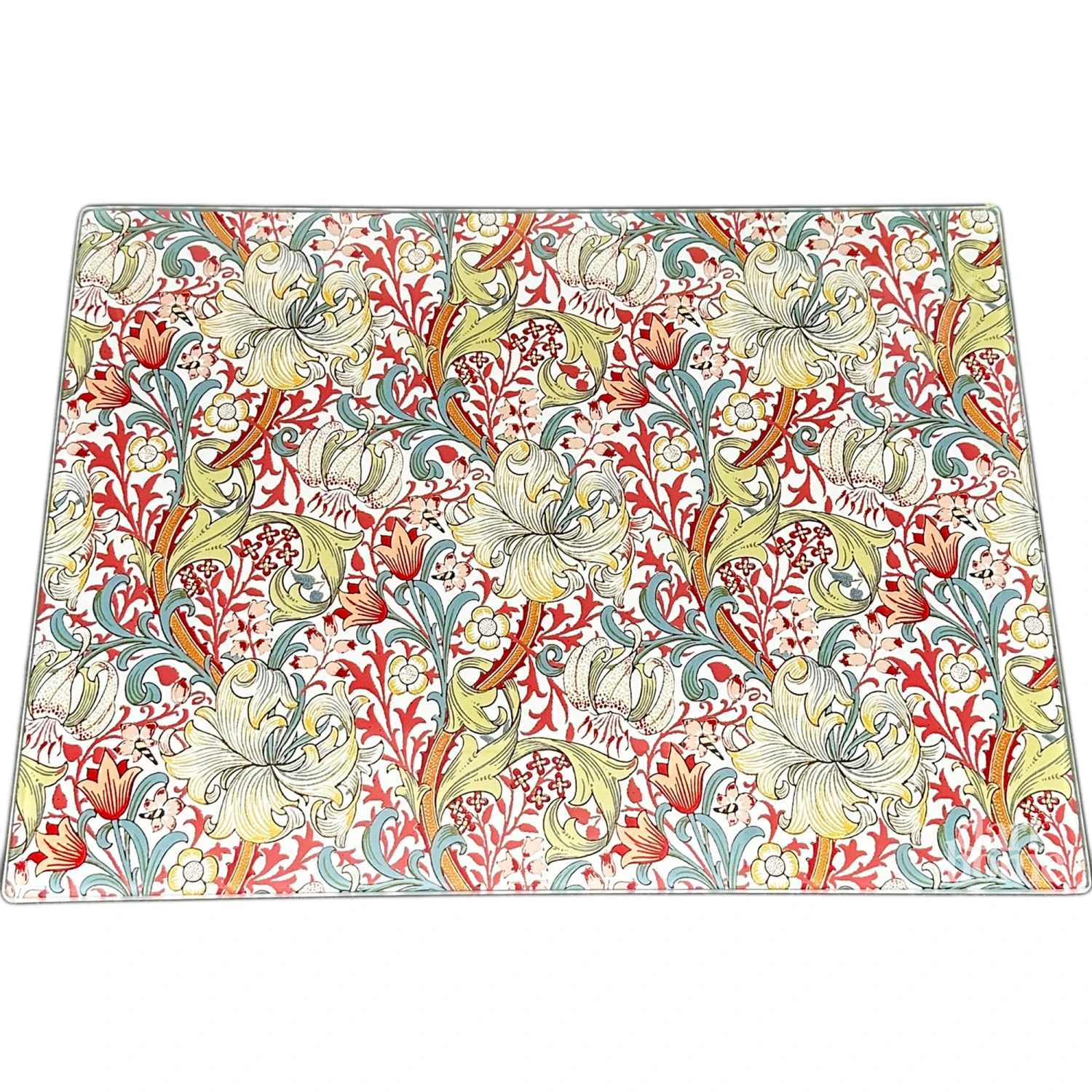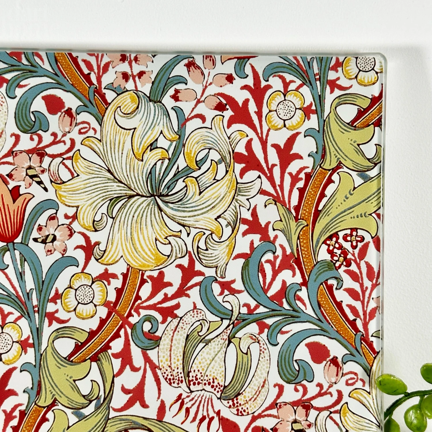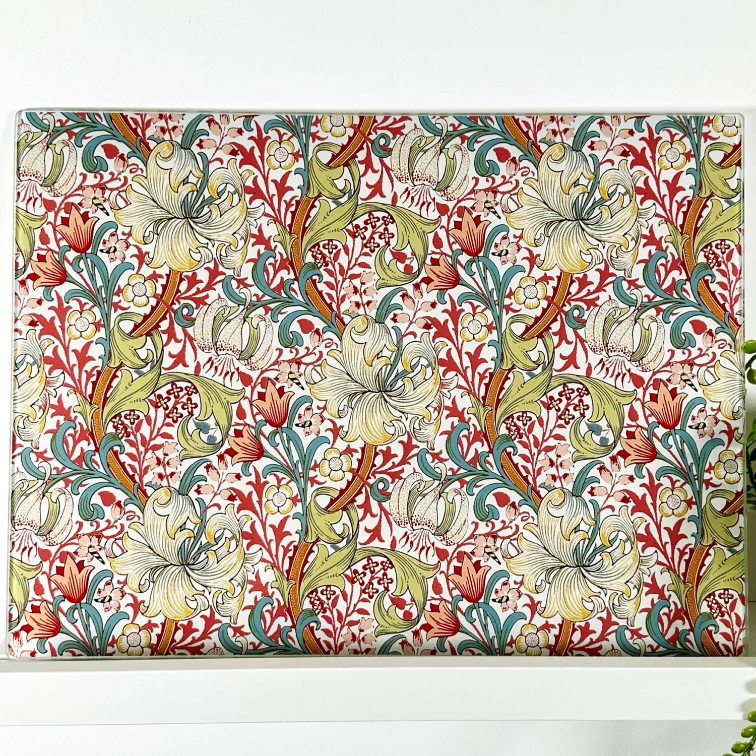 Glass chopping board featuring a classic William Morris printed design, Golden Lily. Will be a great kitchen worktop saver and protector when cutting and cooking.