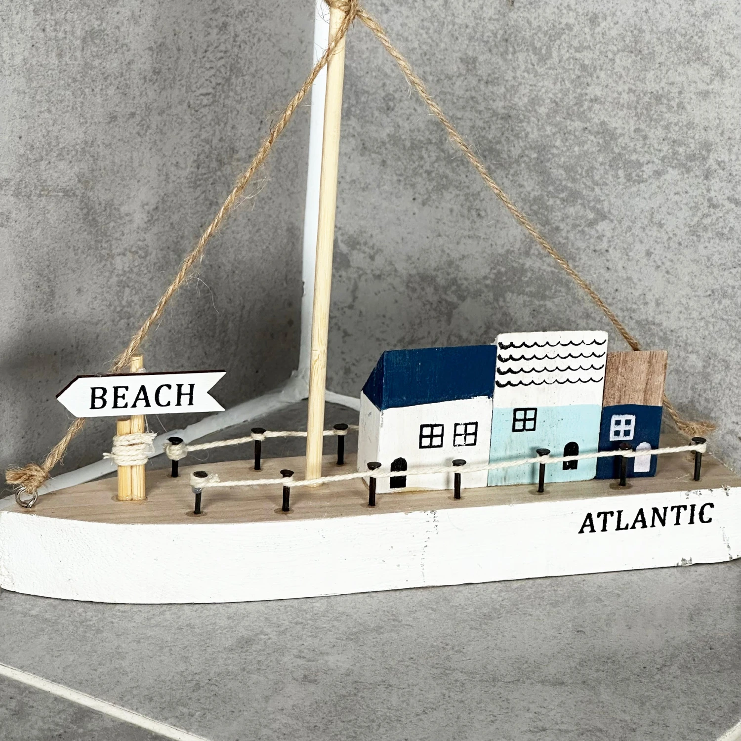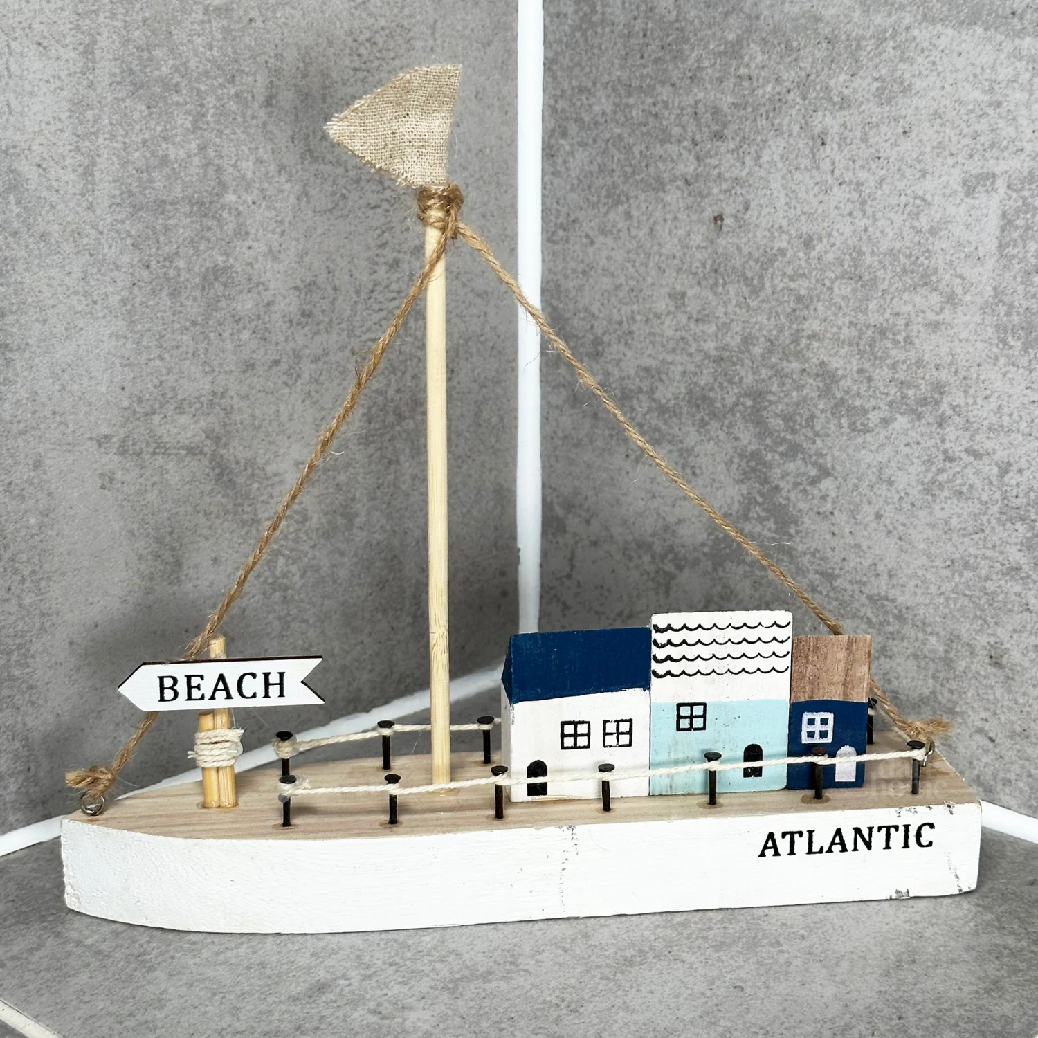 A nautical wooden made Atlantic boat featuring three blue boat houses. This ornament comes with a beach arrow sign along with string and canvas sails. It is a perfect sculpture for your bathroom nautical decor.