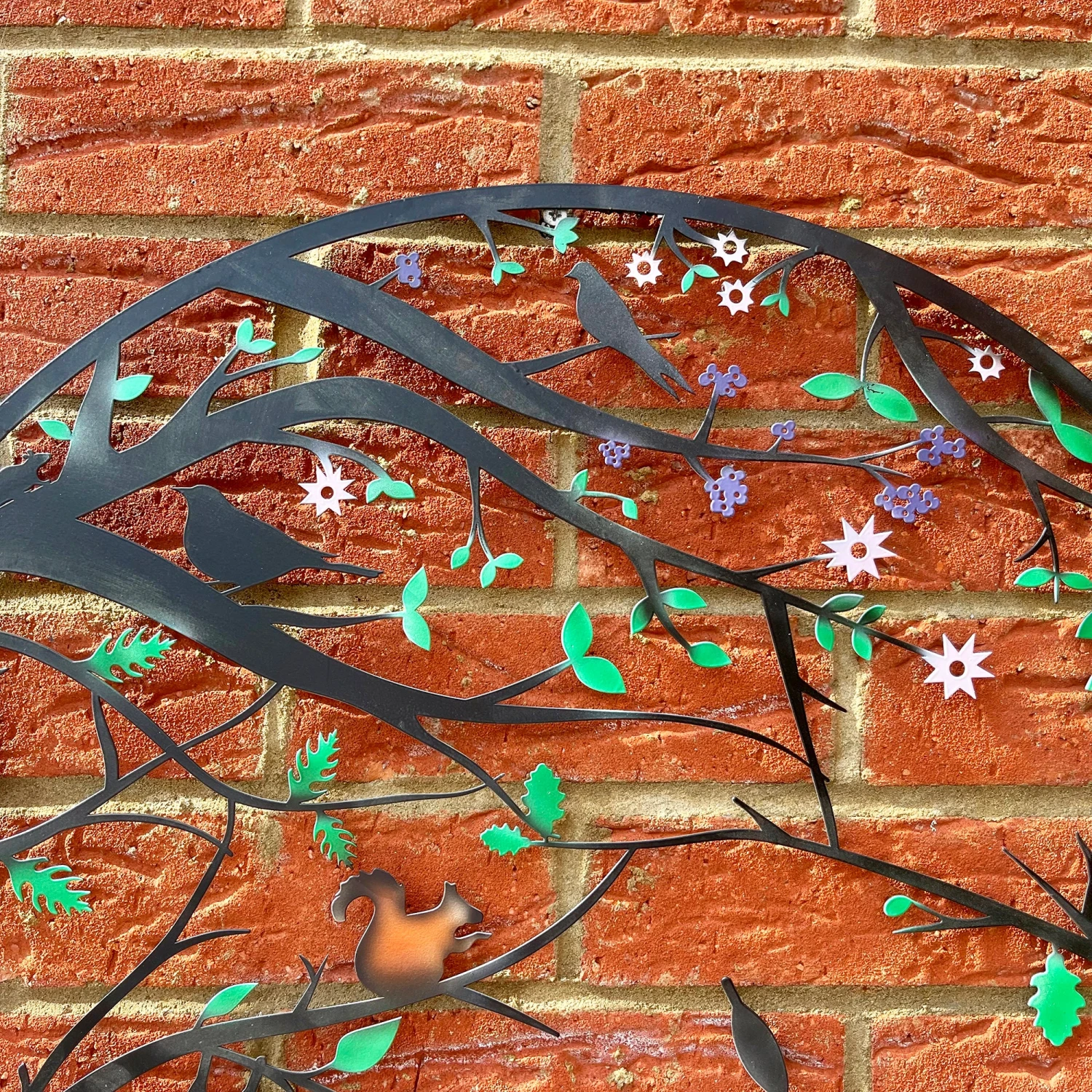 Wildlife themed garden wall art featuring an array of woodland animals like deer, owls and bunny rabbits to name a few. Filled with neatly placed splashes of colour throughout the animals, flowers and trees completely transforming this wall art and bringing everything in it to life. Its open design allows sun to shine through, also offering a glowing silhouette on the wall or fence of your garden space. Perfect gift idea for woodland wildlife lover and an easy decorative piece to personalise and colourise a garden space.