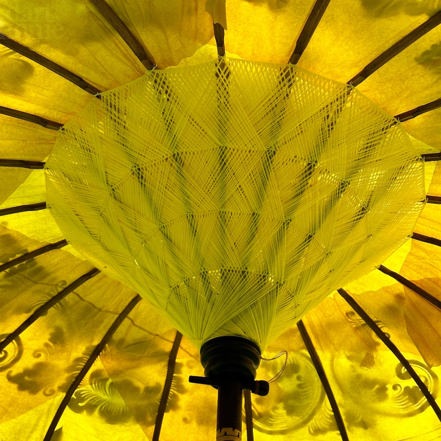 These beautiful bali sun parasols feature a beautiful golden Batik detail and are a traditional ceremonial balinese decoration that glisten when the sun shines on them. They are completely handmade, being hand carved, hand woven and hand printed.