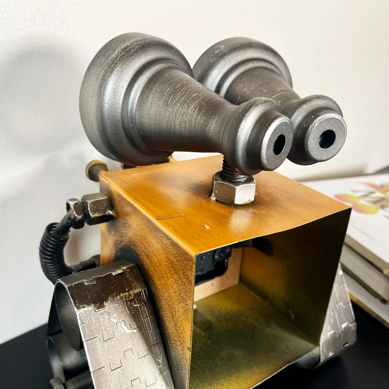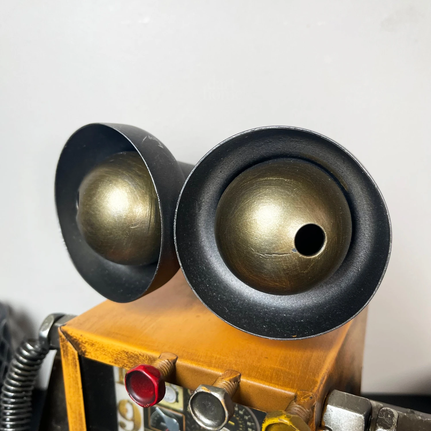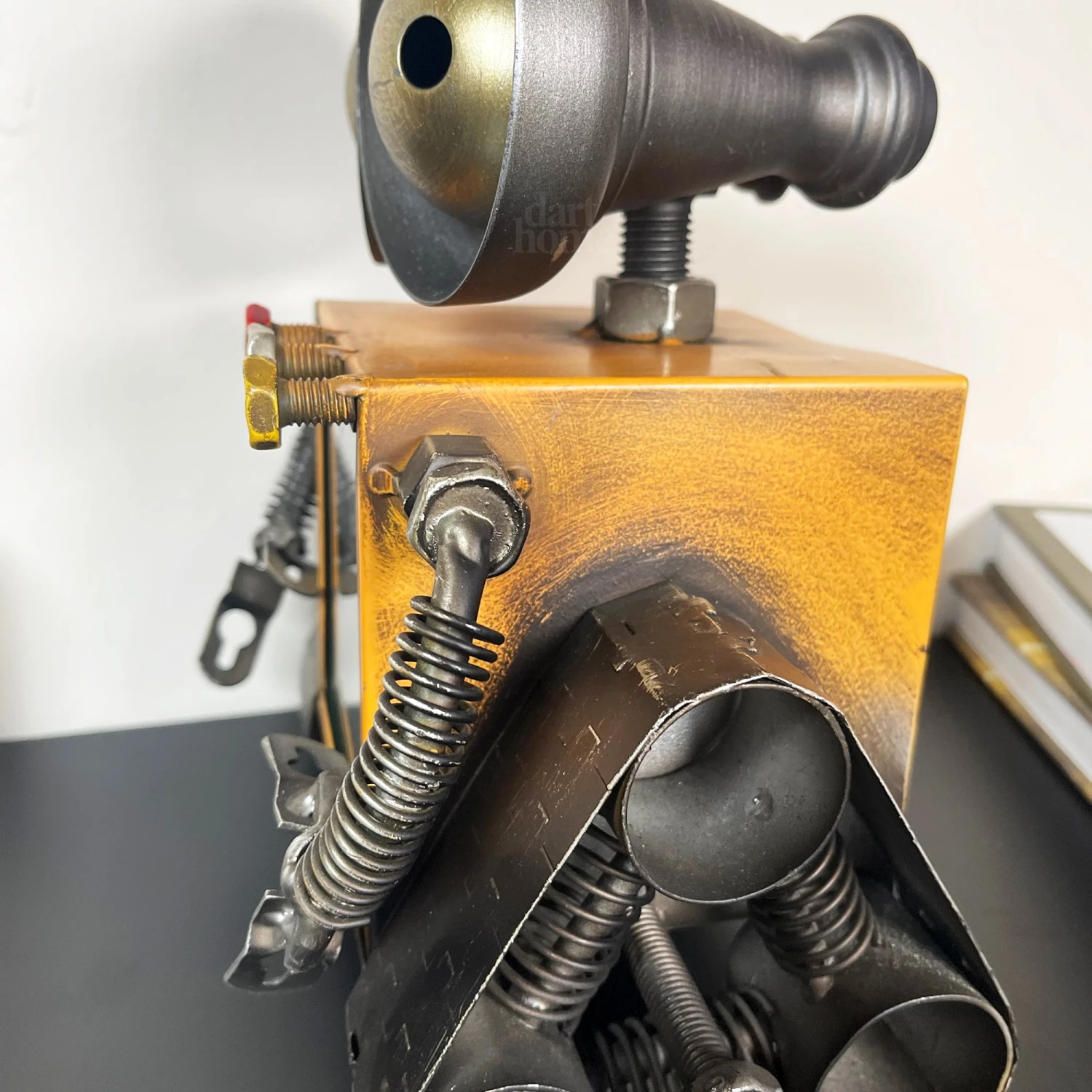 A quirky robotic decoration featuring a yellow robot transformed into a square clock, perfect for a mans gift to style on a desk or bedside table. This yellow robot clock is made from metal with a distressed brushed finish. It features an arabic numeral 12 hour display and is battery operated with an AA battery that is not supplied.
